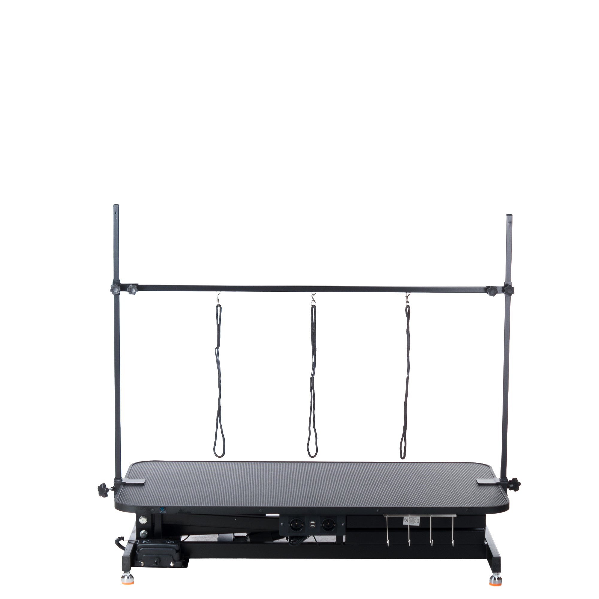 Stół do pielęgnacji zwierząt w rozmiarze XL. Niezwykle stabilny blat stołu pokryty antypoślizgową matową powłoką w kolorze czarnym. Stalowa rama w kolorze czarnym, malowana proszkowo. Elektryczna regulacja wysokości blatu stołu, dzięki której możemy idealnie dopasować się do naszych potrzeb i rozmiaru zwierzęcia. W zestawie regulowany wysokością drążek z trzema smyczami. </P>\n