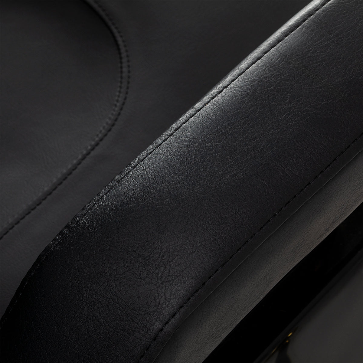 Stabilna, okrągła podstawa w złotym wykończeniu nadaje fotelowi efektowny wygląd i gwarantuje stabilność podczas pracy. Siedzisko, oparcie i podnóżek wypełnione są pianką odporną na odkształcenia i tapicerowane czarną, przyjemną w dotyku skórą syntetyczną, co zapewnia trwałość i wysoki komfort. Powierzchnia odporna na wilgoć i łatwa w pielęgnacji sprawia, że fotel jest idealny do codziennego użytku. Złote detale i charakterystyczne linie tapicerki podkreślają ekskluzywny charakter mebla, nadając mu nowoczesny, lekko motoryzacyjny styl. Elegancki design doskonale wpisuje się w wystrój barber shopów.