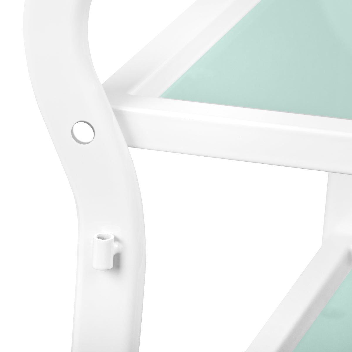 stolik do urządzenia kosmetycznego, wykonany z metalu i szkła, na kółkach. Posiada trzy szklane półki.