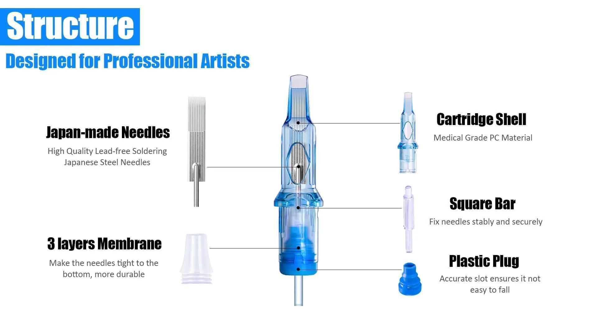 - Materiały premium: Każdy kartridż jest wykonany z wysokiej jakości japońskich igieł ze stali nierdzewnej, połączonych lutowaniem bezołowiowym dla zwiększenia bezpieczeństwa i trwałości. To zaangażowanie w jakość zapewnia artystom pewność pracy.