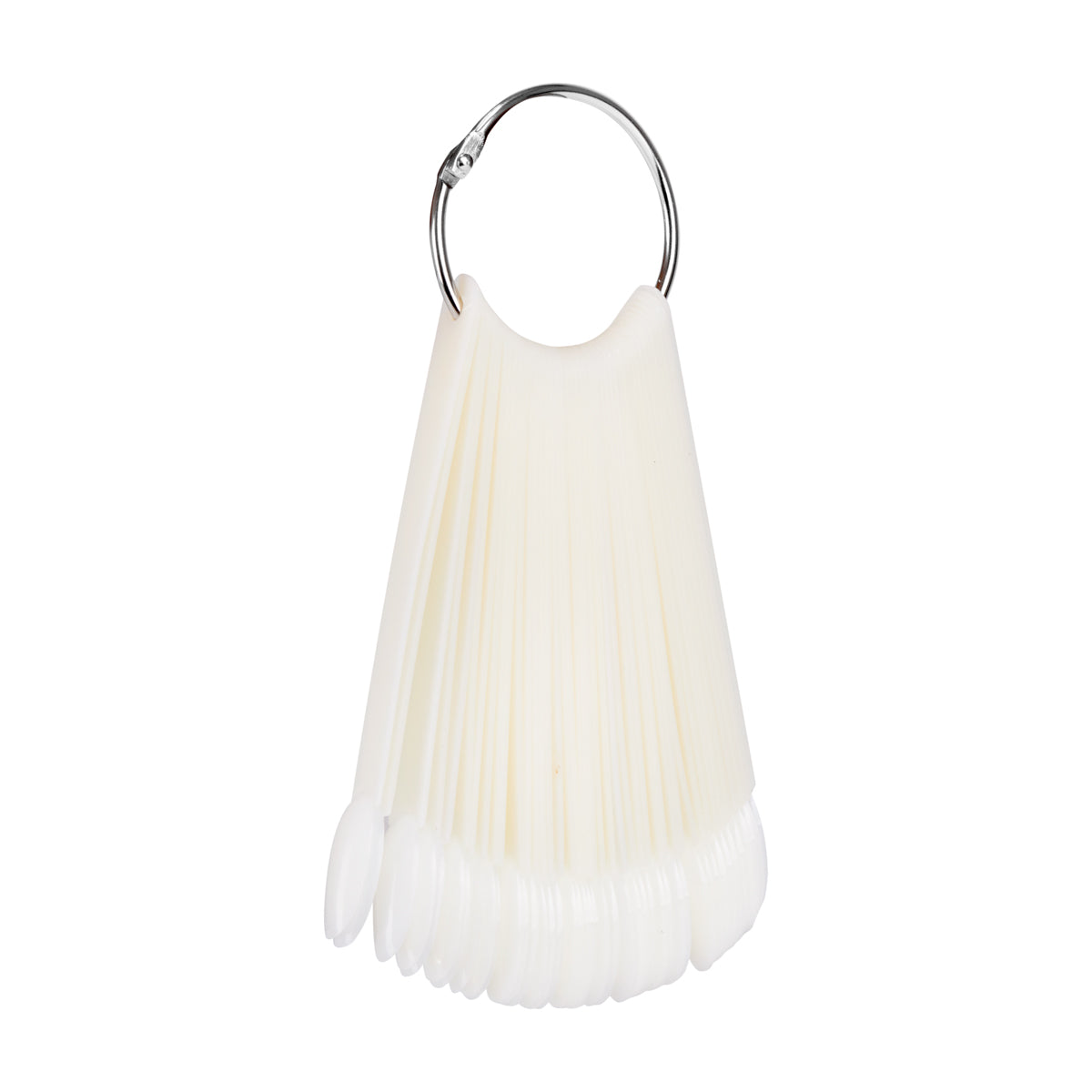 Szablon do paznokci w mlecznym kolorze pozwala estetycznie zaprezentować wszystkie kolory klasycznych i hybrydowych lakierów lub żeli. Składa się z 50 pojedynczych tipsów o owalnym kształcie i rozmiarze odpowiadającym prawdziwym paznokciom. Jest mocowany praktycznym, odpinanym kółkiem, co umożliwia łatwe przechowywanie całego zestawu. Każdy tips wykonany jest z trwałego plastiku.