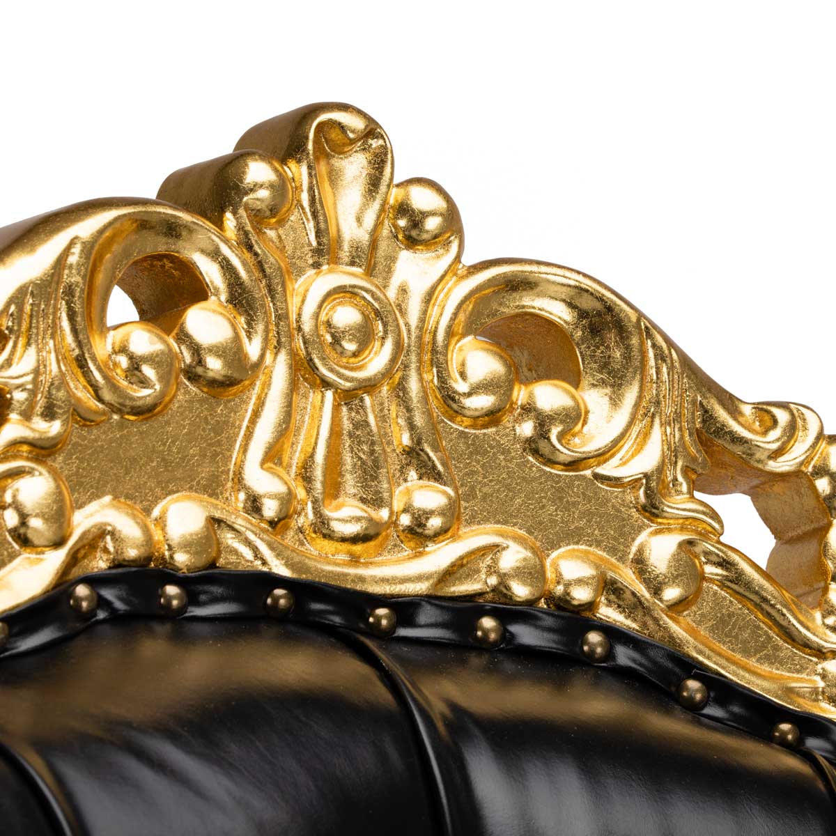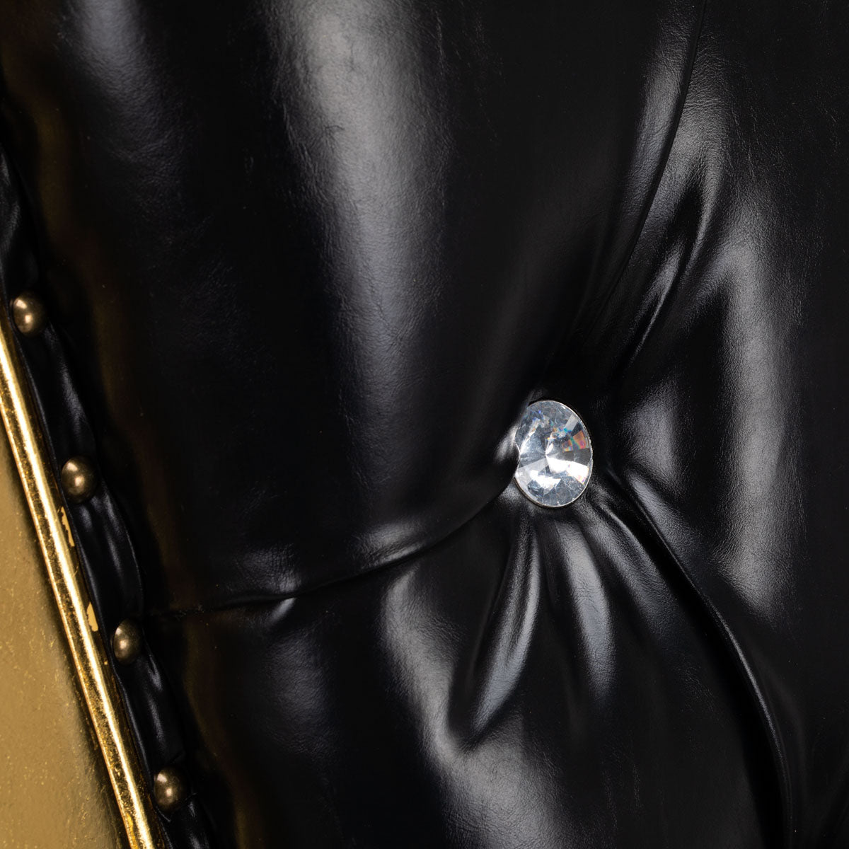 Trwała podstawa w odcieniach bieli zapewnia stabilność podczas zabiegów, a jej gładka powierzchnia jest łatwa do utrzymania w czystości. Krzesło wypełnione jest pianką i pokryte przyjemną w dotyku ekoskórą w odcieniach czerni. Dzięki zastosowaniu takiego materiału wyposażenie jest odporne na wilgoć i ścieranie, a jednocześnie mało wymagające w czyszczeniu. Wykończenie z ozdobnymi elementami w odcieniach postarzanego złota, pikowaniem i dekoracyjnymi guzikami nadaje mu niepowtarzalny wyraz. Efektowny stojak do pedicure Tron pozwoli podkreślić wyrafinowany charakter salonu i z pewnością pozostanie w pamięci klientów.