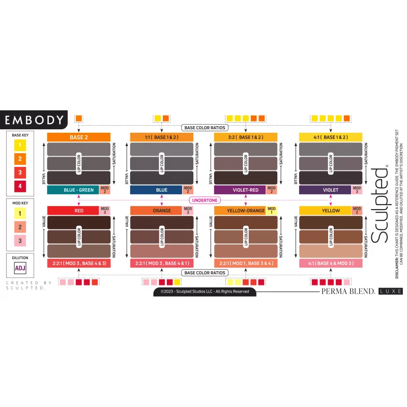 Zestaw Carla Ricciardone Embody został opracowany we współpracy z Perma Blend LUXE. Te osiem pigmentów do makijażu permanentnego ust zostało fachowo stworzone, aby neutralizować chłodne i ciemne usta, zapewniając pełne pokrycie dla każdego odcienia skóry. Każdy pigment spełnia normy REACH i jest dostępny w wygodnej butelce o pojemności 15 ml.