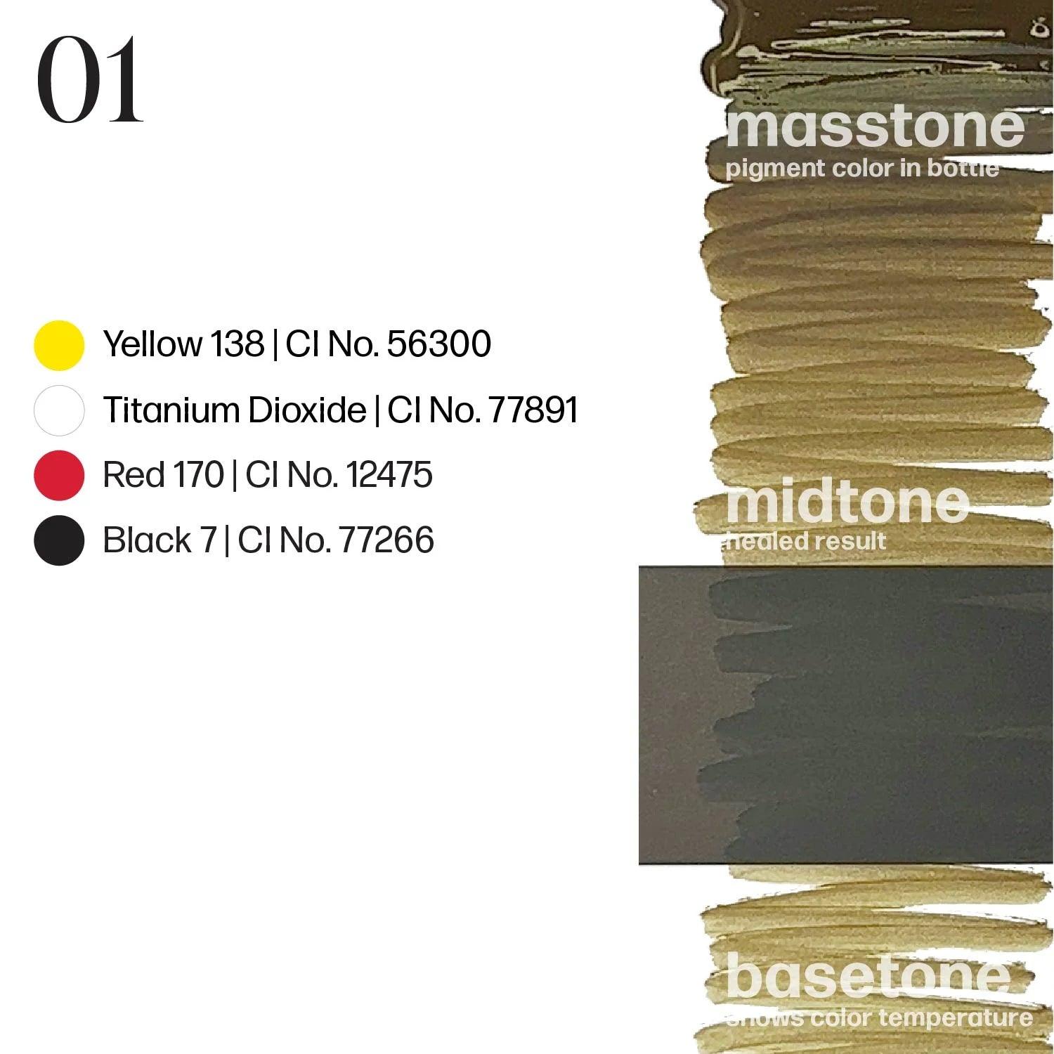 - 01: Jasnobrązowy z żółtą bazą, idealny dla klientów o bardzo jasnej karnacji i jasnych blond włosach.
