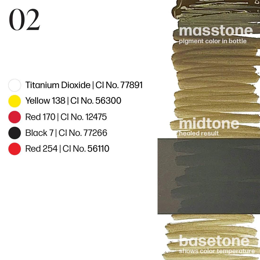 - 02: Ciemniejszy, neutralny odcień, idealny dla klientów o blond włosach i ciepłych lub neutralnych tonach skóry, lub chłodnej karnacji dla chłodniejszego efektu po wygojeniu.