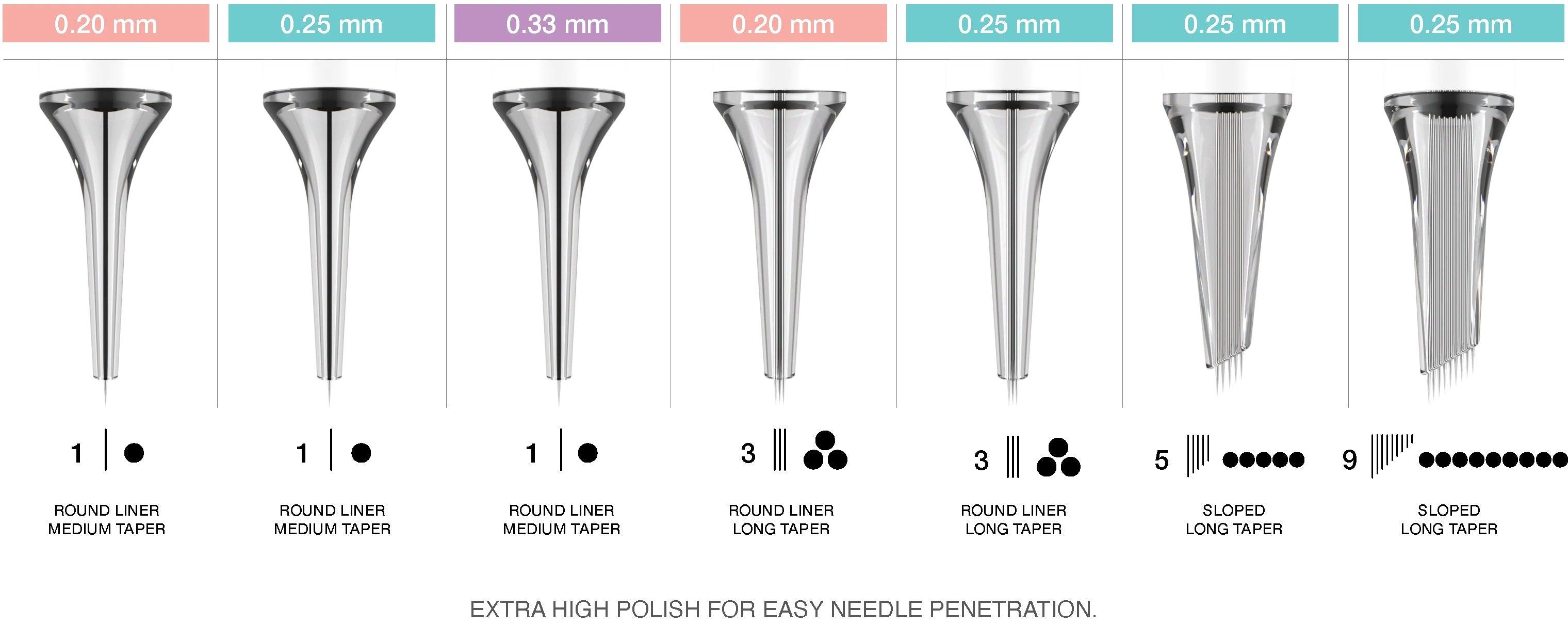 - 3RS 0,25 mm średni stożek: Idealna do tworzenia miękkich krawędzi i subtelnego cieniowania, ta igła jest doskonała dla artystów chcących płynnie mieszać kolory.