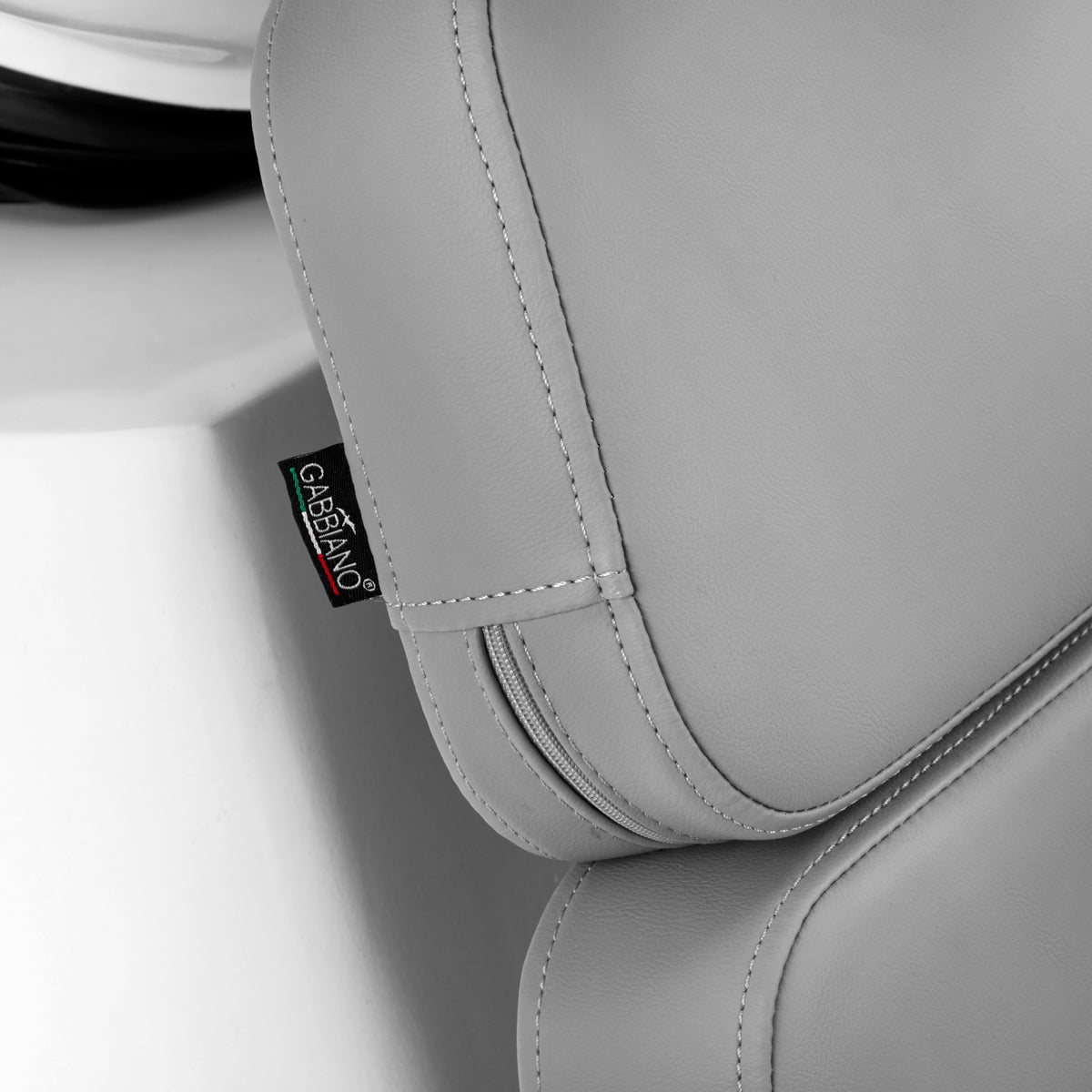 Wyprofilowany fotel zapewnia odpowiednie podparcie lędźwiowe, a tym samym wysoki komfort użytkowania. Metalowe podłokietniki w odcieniach chromu o geometrycznym kształcie pozwalają na prawidłowe ustawienie ramion klienta. Wypełnienie z trwałej, odpornej na odkształcenia pianki oraz tapicerka z przyjemnej w dotyku skóry syntetycznej w odcieniach szarości zapewniają trwałość mebli, łatwość czyszczenia i komfortowe użytkowanie przez długi czas. Oryginalny, elegancki wygląd myjni nadaje wnętrzu niepowtarzalny wyraz. Zestaw zawiera kompletne okucia w odcieniach chromu, w tym baterię, słuchawkę prysznicową oraz dedykowane węże, aby zapewnić kompletny zestaw narzędzi do pracy.