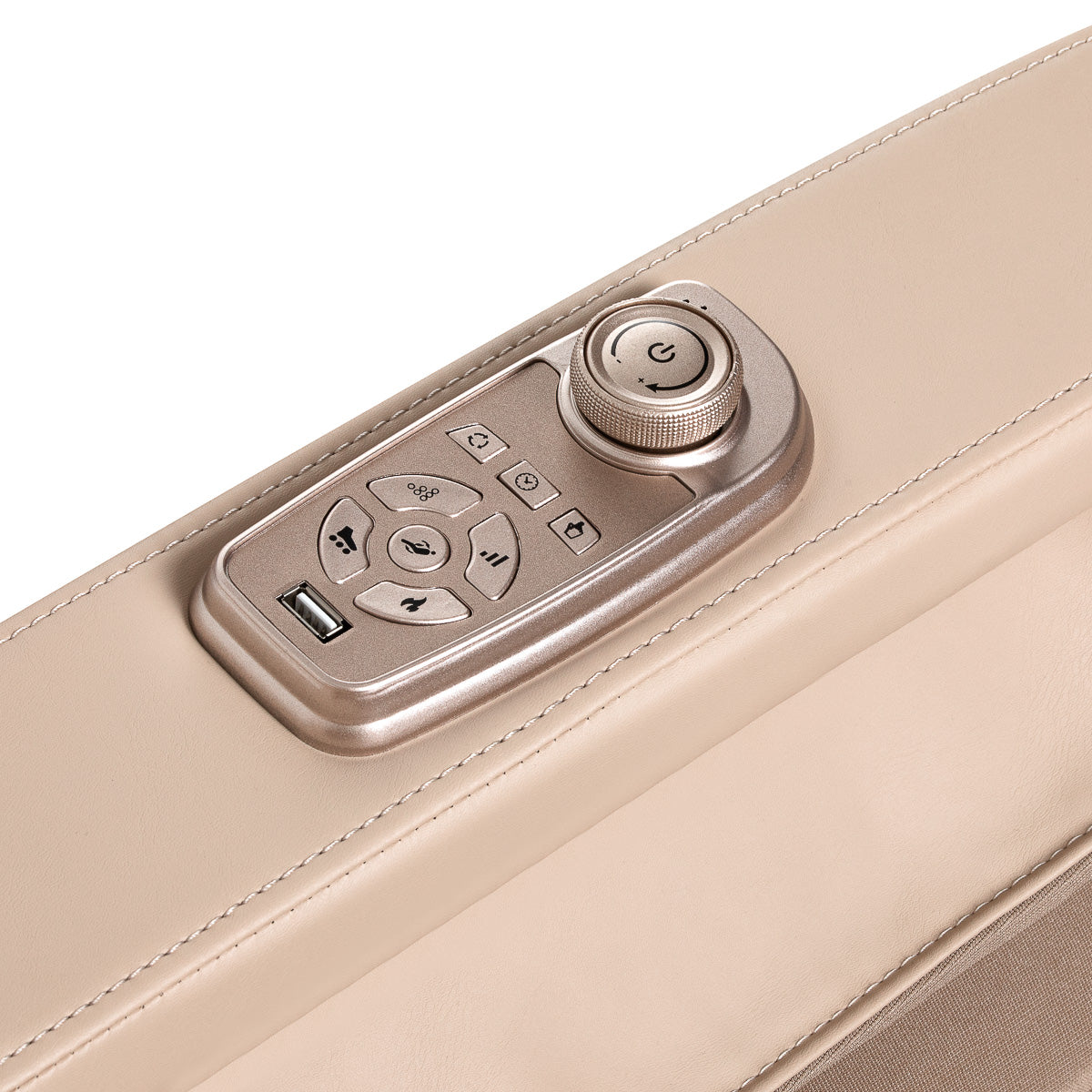 Dla jeszcze większego komfortu fotel wyposażono w zestaw przycisków sterujących wbudowanych w lewy podłokietnik. Poręczne sterowanie umożliwia szybki dostęp do najważniejszych funkcji bez konieczności sięgania po główny panel. Można go używać do łatwej zmiany trybu masażu, uruchomienia masażu stóp lub aktywacji funkcji Zero Gravity – wszystko z myślą o maksymalnym komforcie i błogim relaksie. Wyposażony jest także w port USB, który pozwala na ładowanie telefonu podczas masażu.