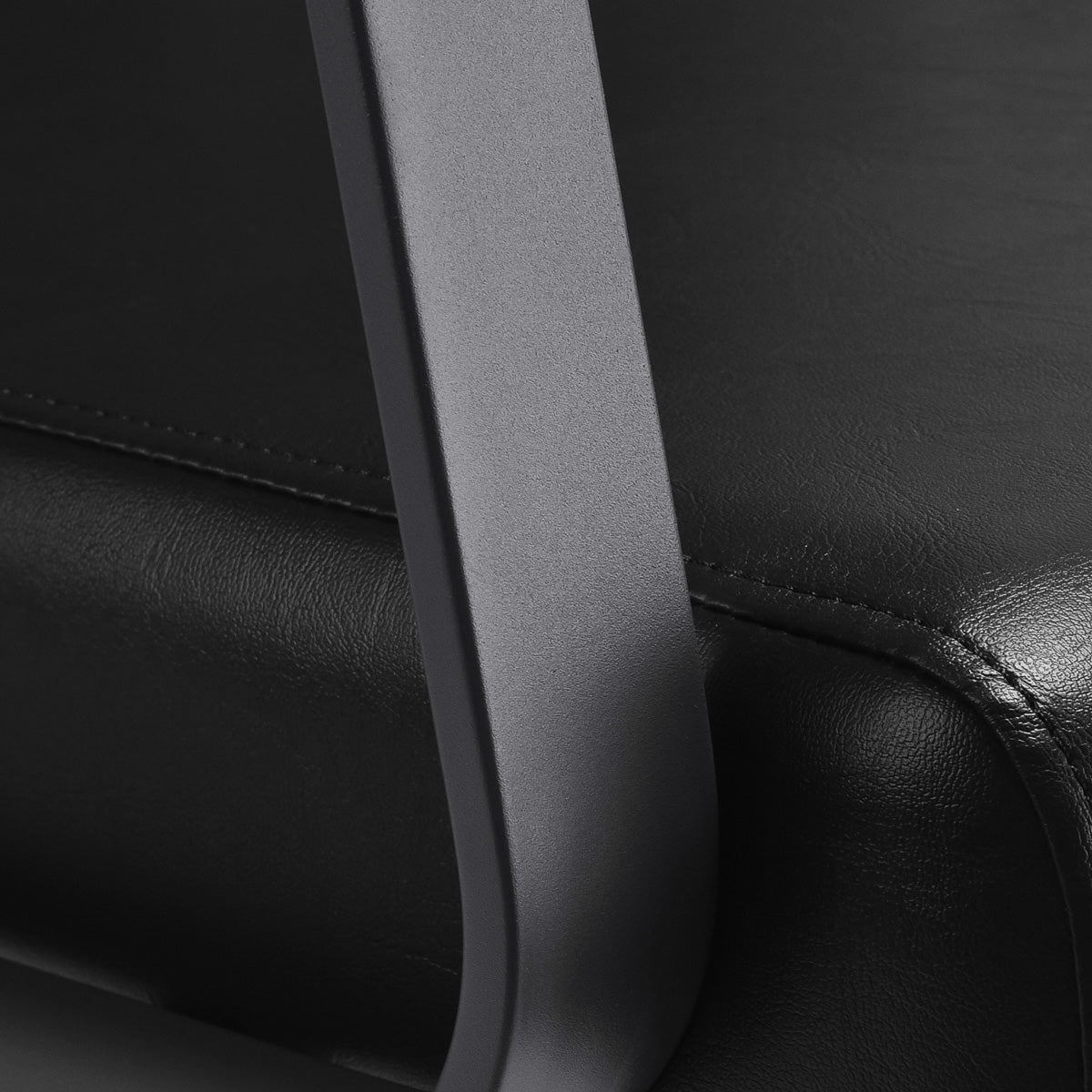 Wyprofilowany fotel zapewnia odpowiednie podparcie lędźwiowe, a tym samym wysoki komfort użytkowania. Metalowe podłokietniki w odcieniach szarości o geometrycznym kształcie pozwalają na prawidłowe ustawienie ramion klienta. Wypełnienie z trwałej, odpornej na odkształcenia pianki oraz tapicerka z przyjemnej w dotyku skóry syntetycznej w odcieniach czerni zapewniają trwałość mebli, łatwość czyszczenia oraz komfortowe użytkowanie przez długi czas. Oryginalny, elegancki wygląd myjni nadaje wnętrzu niepowtarzalny wyraz. Zestaw zawiera kompletne okucia w odcieniach czerni, w tym baterię, słuchawkę prysznicową oraz dedykowane węże, aby zapewnić kompletny zestaw narzędzi do pracy.