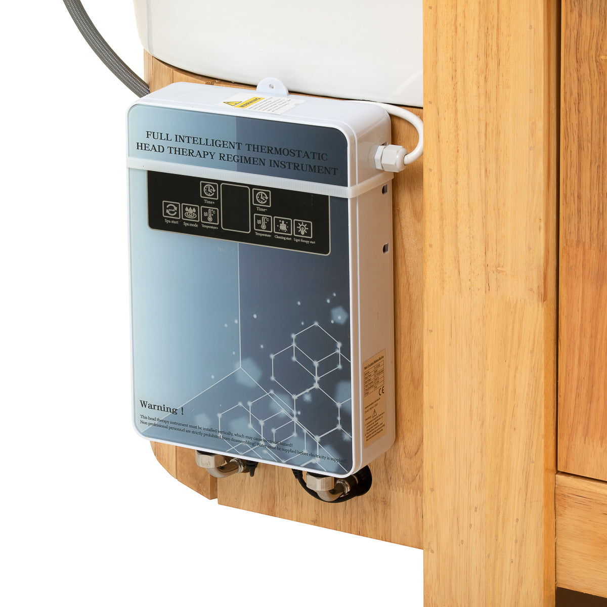 Intuicyjny panel dotykowy umożliwia pełną kontrolę nad parametrami zabiegu, zapewniając łatwość obsługi. Pozwala na regulację czasu pracy i temperatury wody, a także monitorowanie ustawień w czasie rzeczywistym. Panel umożliwia także aktywację terapii światłem – światło w misie tworzy relaksującą atmosferę i podkreśla luksusowy charakter zabiegu. Dodatkowo urządzenie do terapii parowej wyposażone jest w pilot do wygodnej obsługi.