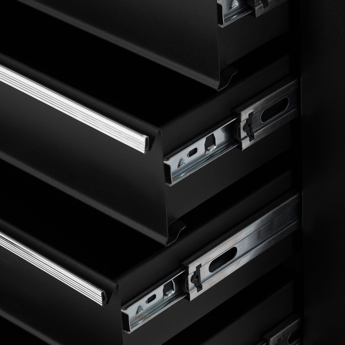 Model wyposażony jest w pięć pojemnych szuflad, co zapewnia dużo miejsca na niezbędne narzędzia, produkty higieniczne oraz jednorazowe akcesoria. Przemyślany układ sprzyja porządkowi i właściwej organizacji miejsca pracy. Zamek na klucz zapobiega niekontrolowanemu wysuwaniu szuflad oraz umożliwia przechowywanie delikatniejszych elementów wyposażenia lub dokumentacji.