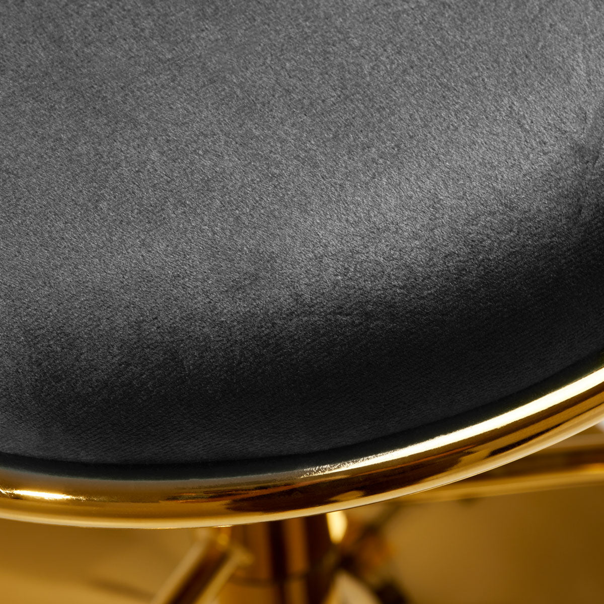 Przyjemna w dotyku, aksamitna tapicerka w odcieniach szarości nadaje stołkowi niepowtarzalny charakter, a estetycznie spleciona tkanina na oparciu podkreśla unikalny wygląd mebla. Wykończenie sprawia, że mebel przyciąga wzrok. Rama w odcieniach złota dodaje elegancji i prestiżu, doskonale komponując się z aksamitem.