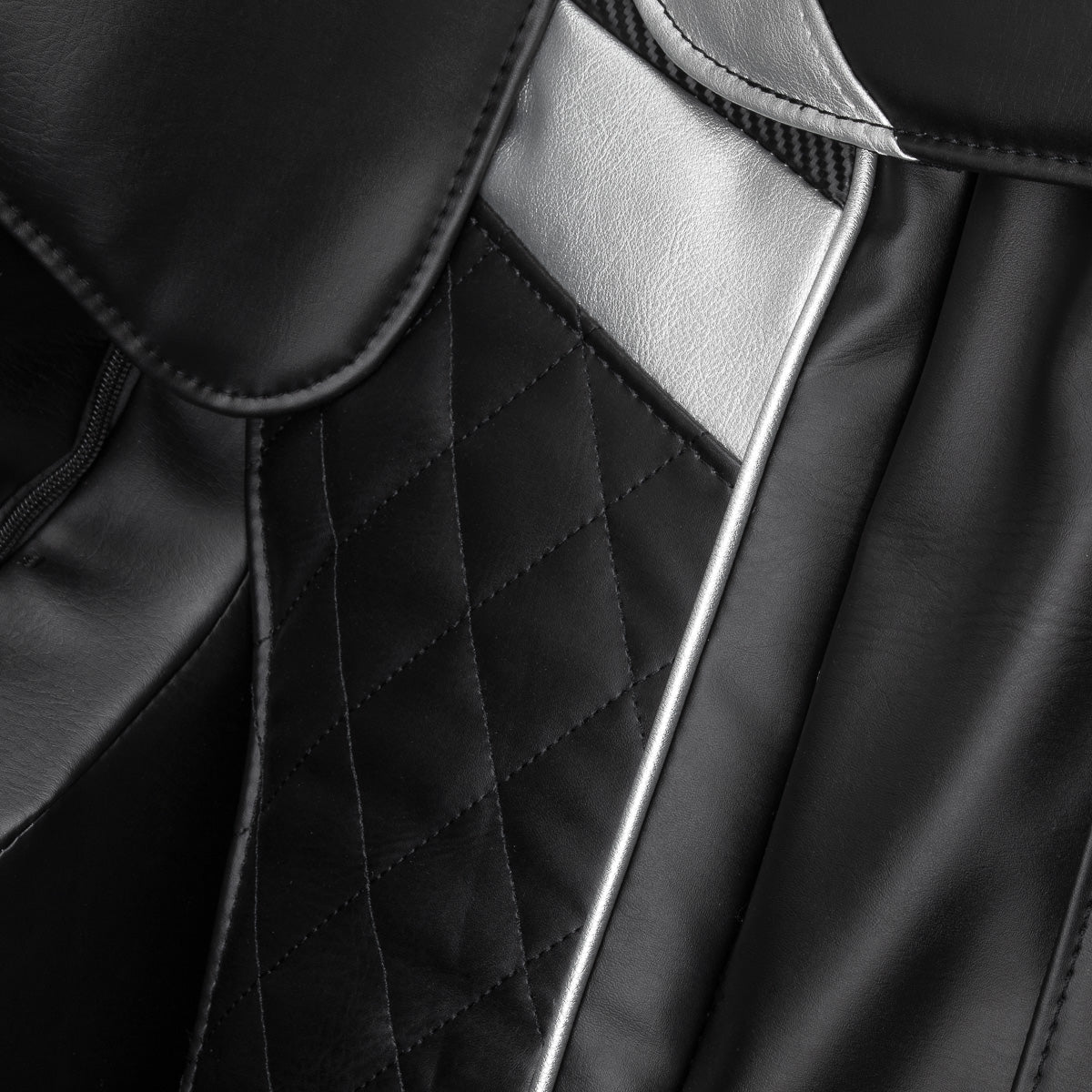 Miękka, przyjemna w dotyku ekoskóra w odcieniach czerni zapewnia wysoki komfort użytkowania i łatwość pielęgnacji. Materiał jest estetyczny, odporny na wilgoć i praktyczny w codziennym użytkowaniu. Zewnętrzne detale w kolorze srebrnym, połączone z fakturowanym wykończeniem w odcieniach czerni, nadają fotelowi nowoczesny, stylowy charakter. Kompaktowa forma i stonowane kolory sprawiają, że model doskonale wpisuje się w różne aranżacje wnętrz. Sakura Prime 101 to idealna propozycja dla osób poszukujących codziennego relaksu – zarówno po intensywnym dniu, jak i po wzmożonym wysiłku fizycznym.