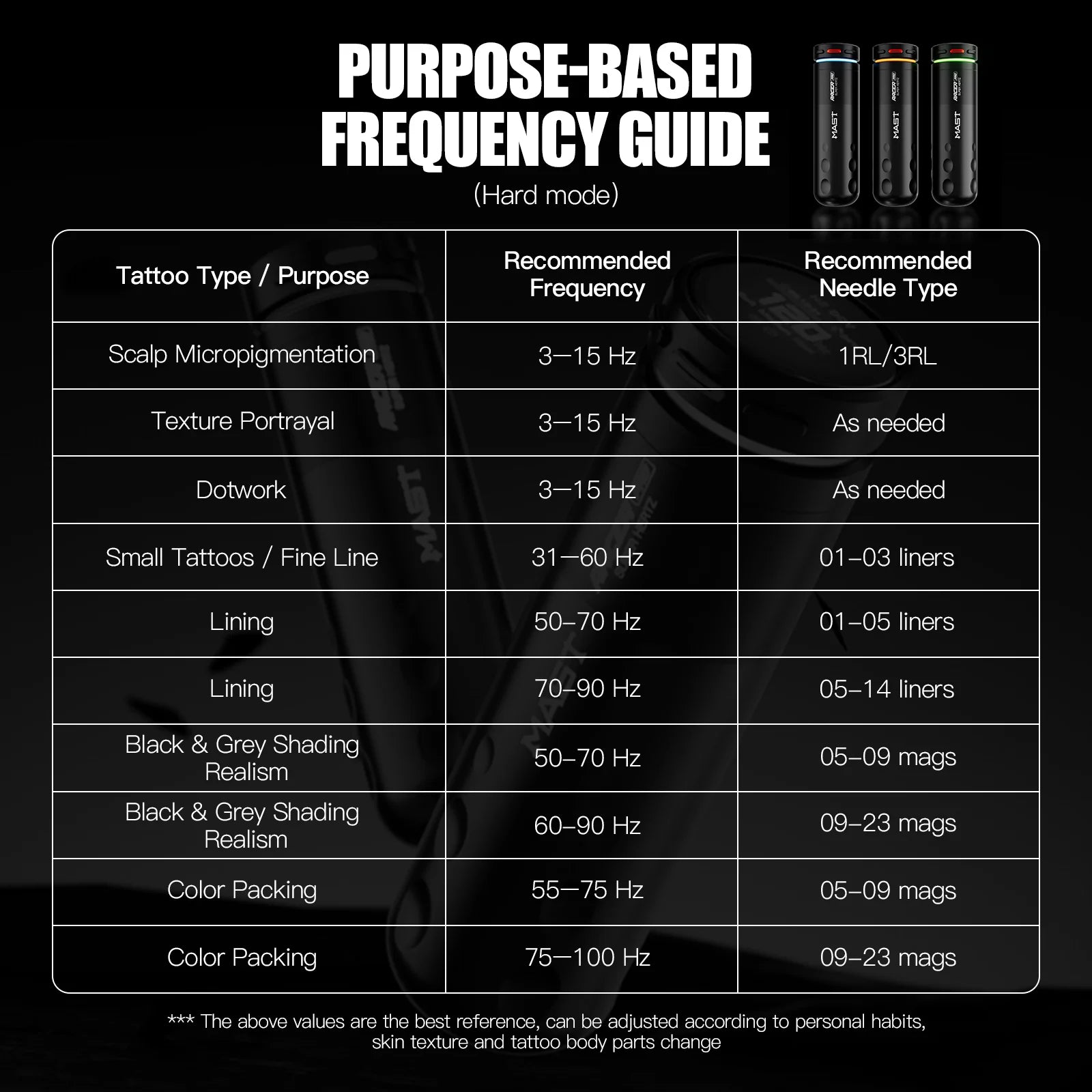 Tryb Hz (3–140Hz) synchronizuje ruch igły z ruchem ręki, zapewniając responsywną, stabilną kontrolę – z ustawieniami miękkim, średnim, twardym i punktowym dla dopasowanej wydajności.