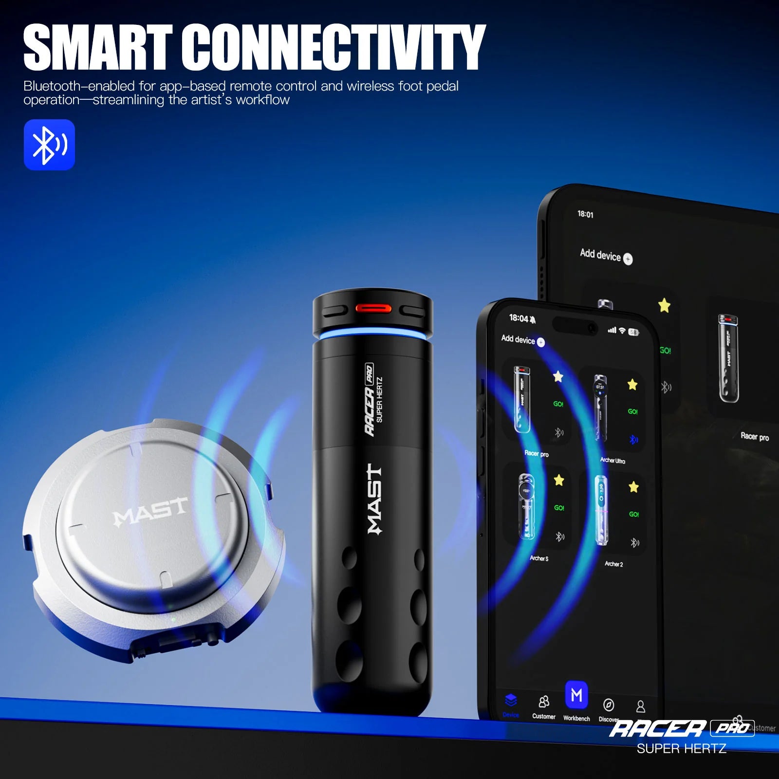 Wyposażony w łączność Bluetooth, wsparcie dla bezprzewodowej stopki nożnej oraz krystalicznie czysty kolorowy wyświetlacz HD o przekątnej 0,85”, Mast Racer Pro daje pełną kontrolę w Twoich rękach – pozwalając skupić się na sztuce, a nie na ustawieniach. Solidny, lekki i zaprojektowany z myślą o precyzji, to nowy standard profesjonalnych bezprzewodowych maszyn do tatuażu.