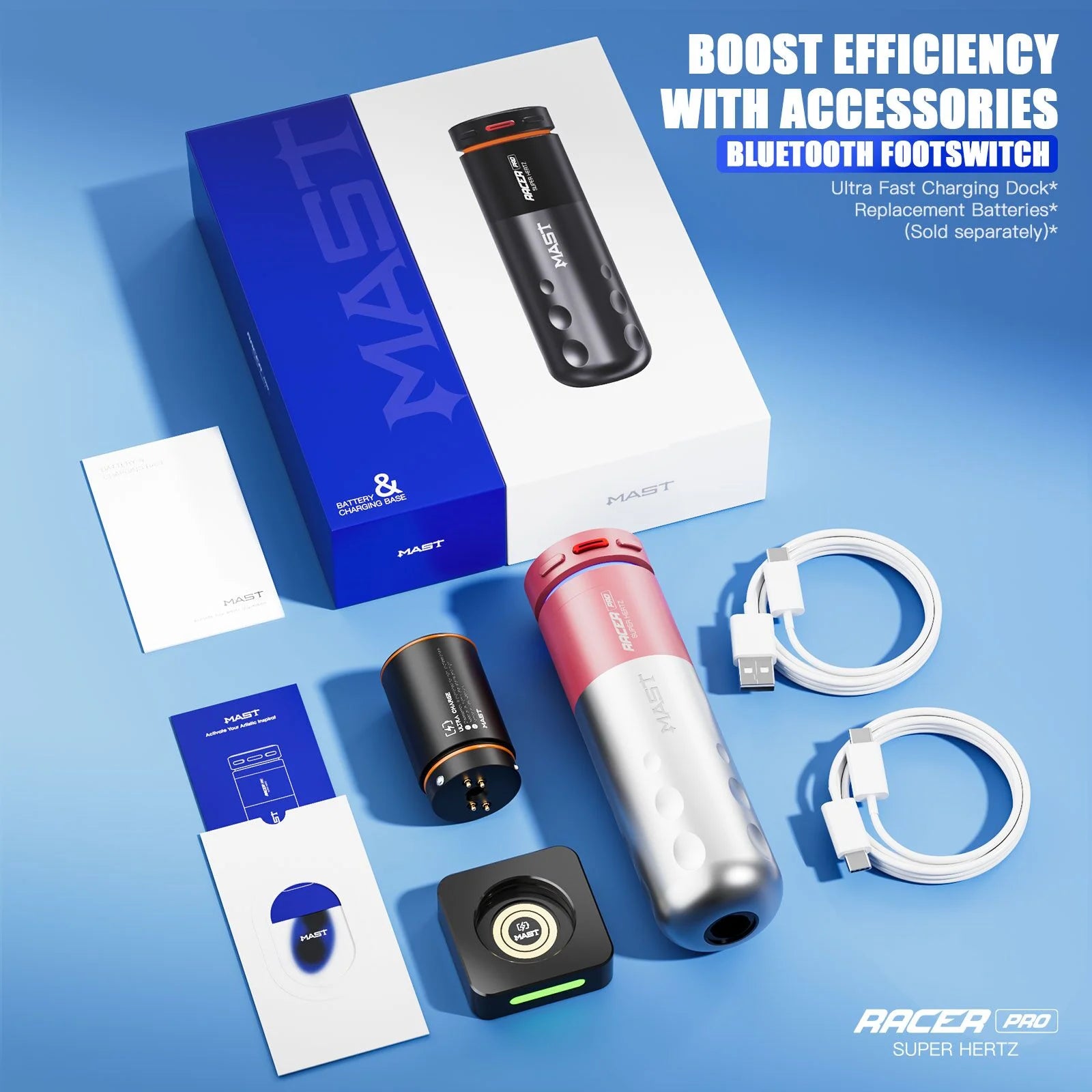 Ulepszona wersja oryginalnego Mast Racer, wersja Pro wprowadza zaawansowany silnik MCORE Pro, zapewniający płynniejszą pracę i idealnie stabilną moc dla każdego stylu tatuażu – od ostrych, cienkich linii po intensywne nasycenie koloru. Inteligentna konstrukcja integruje baterię bezpośrednio w uchwycie, tworząc idealnie wyważone odczucie i zmniejszając zmęczenie nadgarstka podczas długich godzin pracy.