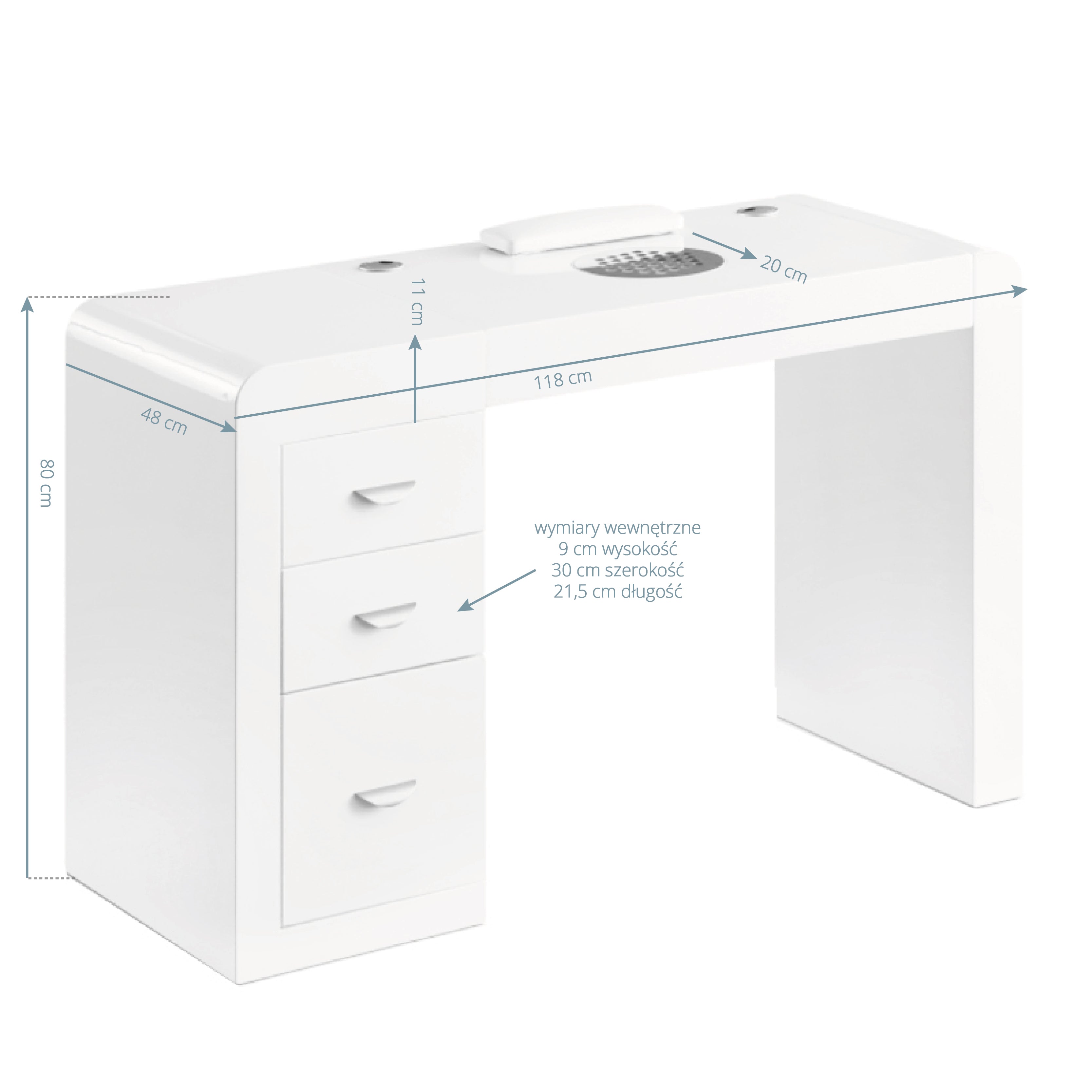 Trzy pojemne szuflady ułatwiają organizację i utrzymanie porządku w najpotrzebniejszych kosmetykach i narzędziach. Biurko wyposażone jest w praktyczny pochłaniacz, który skutecznie redukuje ilość szkodliwego kurzu, zapewniając czyste i świeże powietrze w miejscu pracy. Jednocześnie, dzięki integracji z blatem, nie zajmuje cennej przestrzeni roboczej. Specjalnie zaprojektowane miejsca na kable ułatwiają organizację niezbędnych urządzeń w salonie, takich jak frezarki do paznokci, lampy do zabiegów czy lampy do paznokci, pozwalając na ukrycie przewodów.