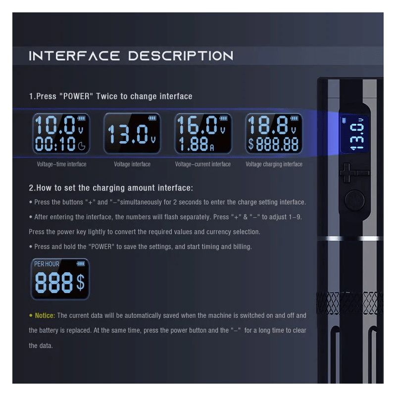 Wyświetlacz OLED dostarcza jasnych i precyzyjnych informacji o napięciu, natężeniu, czasie pracy i stanie ładowania. System obsługi trzema przyciskami umożliwia łatwe regulacje z przyrostami 0,2 V dla precyzyjnego dostosowania pracy. -