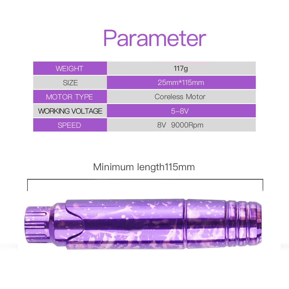 Ten obrotowy długopis do tatuażu jest uniwersalnie kompatybilny ze wszystkimi kartridżami igieł, co pozwala na bezproblemową integrację z każdym profesjonalnym zestawem. Zbudowany z precyzją wysokiej prędkości, działa przy 10V/10 000 RPM, zapewniając stałą moc dla bezbłędnego wykonania każdego tatuażu.