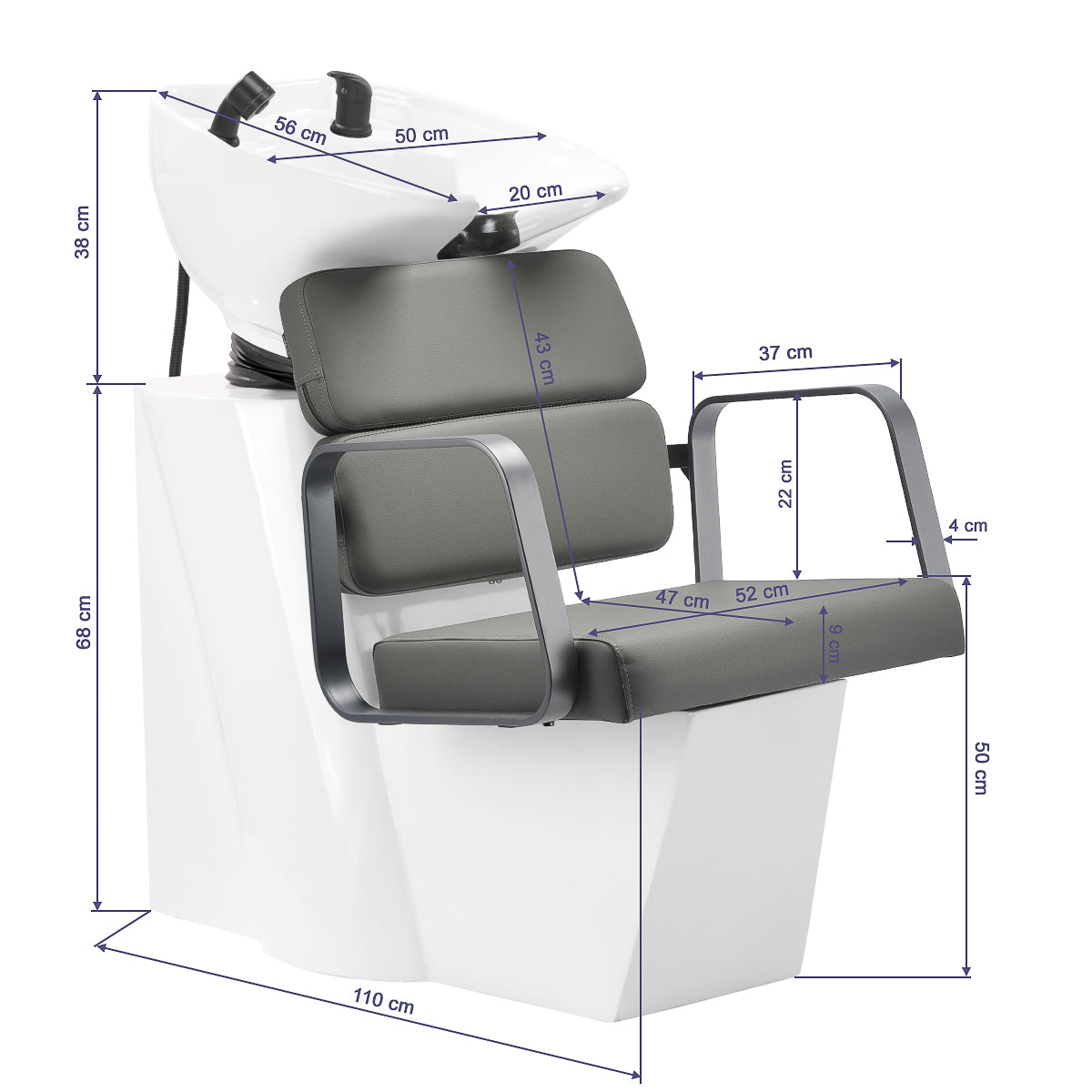 Wyprofilowany fotel zapewnia odpowiednie podparcie lędźwiowe, a tym samym wysoki komfort użytkowania. Metalowe podłokietniki w odcieniach szarości o geometrycznym kształcie pozwalają na prawidłowe ustawienie ramion klienta. Wypełnienie z trwałej, odpornej na odkształcenia pianki oraz tapicerka z przyjemnej w dotyku skóry syntetycznej w odcieniach szarości zapewniają trwałość mebli, łatwość czyszczenia i komfortowe użytkowanie przez długi czas. Oryginalny, elegancki wygląd myjni nadaje wnętrzu niepowtarzalny wyraz. Zestaw zawiera kompletne okucia w odcieniach czerni, w tym baterię, słuchawkę prysznicową oraz dedykowane węże, aby zapewnić kompletny zestaw narzędzi do pracy.