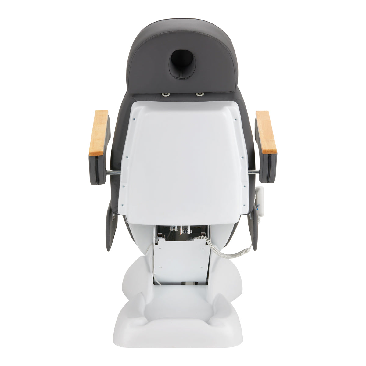 Fotel wypełniony jest pianką o odpowiedniej twardości i pokryty przyjemną w dotyku ekoskórą w odcieniach szarości. Dzięki zastosowaniu materiału, który jest łatwy do utrzymania w czystości i odporny na wybrane środki dezynfekujące, sprzęt jest wygodny w użytkowaniu, odporny na wilgoć i łatwy do czyszczenia. Solidna podstawa wykonana z trwałego materiału w odcieniach bieli zapewnia stabilność podczas zabiegów. Ozdobne drewniane elementy na podłokietnikach wyróżniają fotel spośród innych modeli, stanowiąc estetyczny, elegancki akcent. Odpowiednio profilowane obszycia nadają fotelowi stylowy wygląd i czynią siedzisko ergonomicznym.