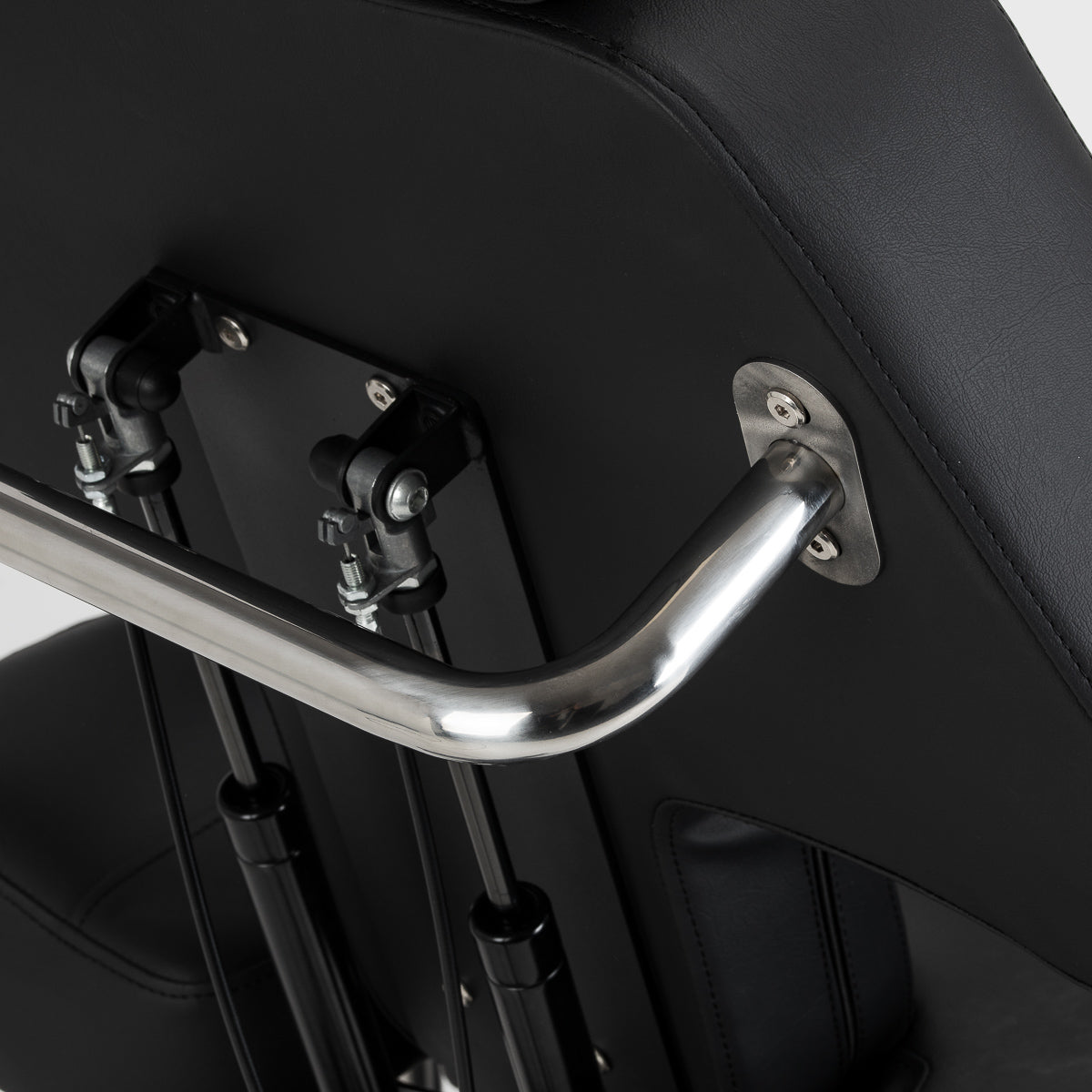 The full rotation mechanism with a lock function provides exceptional functionality, facilitating easy access to the client from all sides and improving work even in confined spaces. The chair's design allows it to be reclined to a comfortable position, and the opening in the headrest, hidden under the cushion, provides adequate support and comfort during treatments in various positions. An additional convenience is the leg rest, which allows for comfortable straddling, and its extension adjustment allows it to be adapted to the needs of users of different heights.