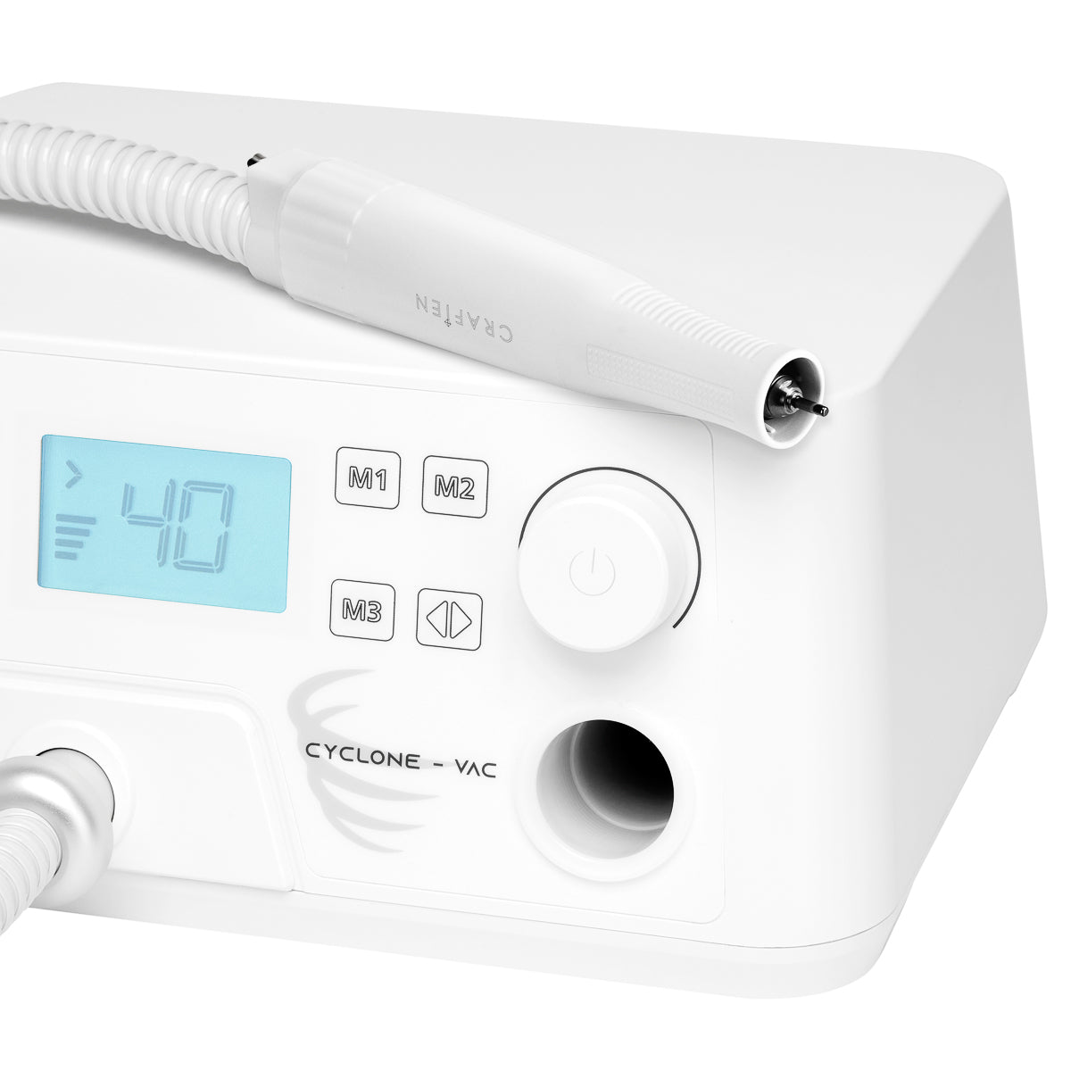 Estetyczny, futurystyczny design w odcieniach bieli doskonale wpasuje się w każde wnętrze. Specjalne miejsce na odłożenie głowicy pozwala na znacznie wygodniejszą pracę, a antypoślizgowe nóżki zapewniają stabilność urządzenia podczas użytkowania. Frezarka Saeyang Cyclone-Vac z absorberem objęta jest 12-miesięczną gwarancją.