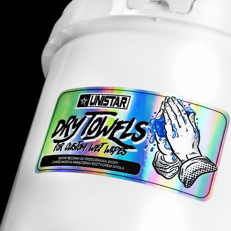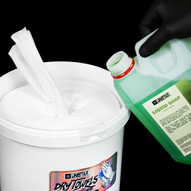 Unistar Chusteczki Nasączalne dostępne są w bezpiecznym, szczelnym wiadrze, które pozwala nasączyć je wybranym mydłem, środkiem dezynfekującym lub płynem czyszczącym. W ciągu kilku sekund otrzymasz 200 gotowych do użycia chusteczek, wygodnie dozowanych przez wbudowany dozownik dla szybkiego i łatwego dostępu.