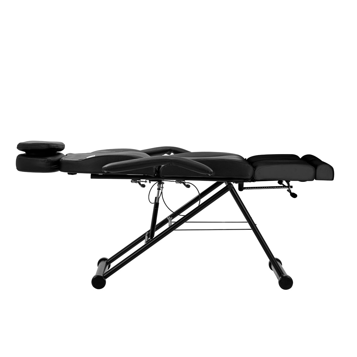 Podstawa fotela ma stałą wysokość, dzięki czemu siedzisko znajduje się na stałym poziomie, co powinno zapewnić komfort podczas użytkowania. Solidna metalowa rama w odcieniach czerni zapewnia niezbędną stabilność podczas użytkowania. Zagłówek, który wysuwa się o około 15 cm, zapewnia doskonałe podparcie głowy, niezależnie od wzrostu klienta. Pozwala to na swobodne wykonywanie różnych rodzajów zabiegów, w tym kosmetologii, fizjoterapii i tatuażu.
