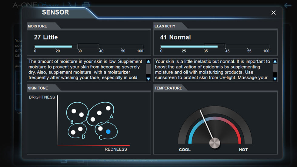 Dzięki obsłudze jednym kliknięciem, A-ONE Smart oferuje analizę całej twarzy wykorzystując opatentowane rozpoznawanie twarzy AI, oświetlenie wielospektralne (normalne, UV i spolaryzowane) oraz obrazowanie wysokiej rozdzielczości. Ten potężny system mierzy osiem kluczowych wskaźników skóry — rozmiar porów, sebum, zmarszczki, pigmentację, koloryt skóry, temperaturę, nawilżenie i elastyczność — umożliwiając dokładne, natychmiastowe oceny.