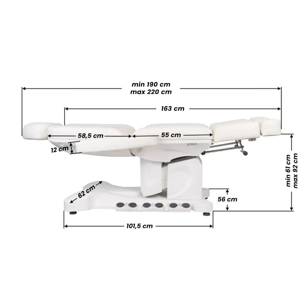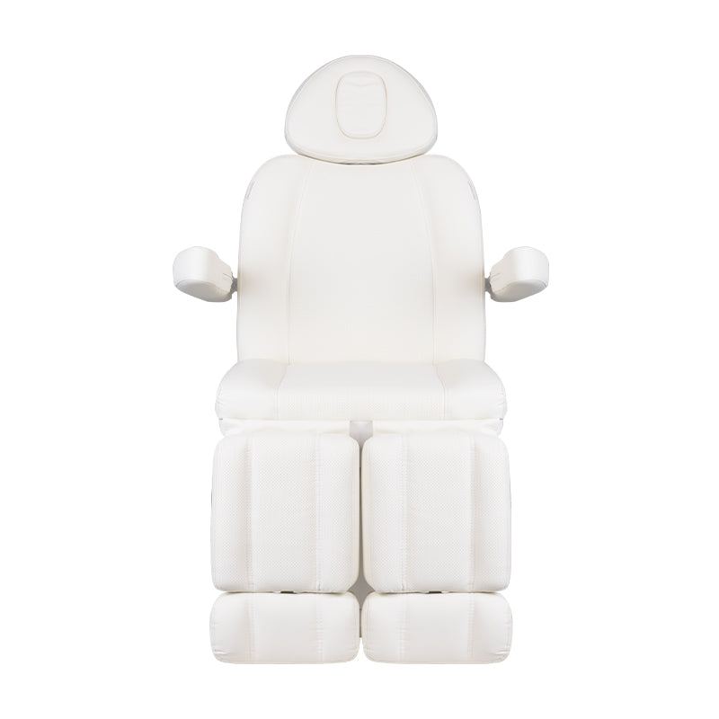 Unikalny elektryczny fotel kosmetyczny, idealnie nadający się do salonów piękności i SPA. Dzięki niezależnym siłownikom pozwala na regulację fotela w 3 płaszczyznach za pomocą pilota i przełączników nożnych, dając możliwość komfortowych zabiegów pedicure oraz zabiegów na twarz i ciało. Korzystając z pilota, możemy użyć zaprogramowanych ustawień oraz uruchomić funkcję HOT, czyli podgrzewanie. Fotel posiada perforowane obicie, niespotykane w innych fotelach, oraz kolorowe oświetlenie LED podstawy.