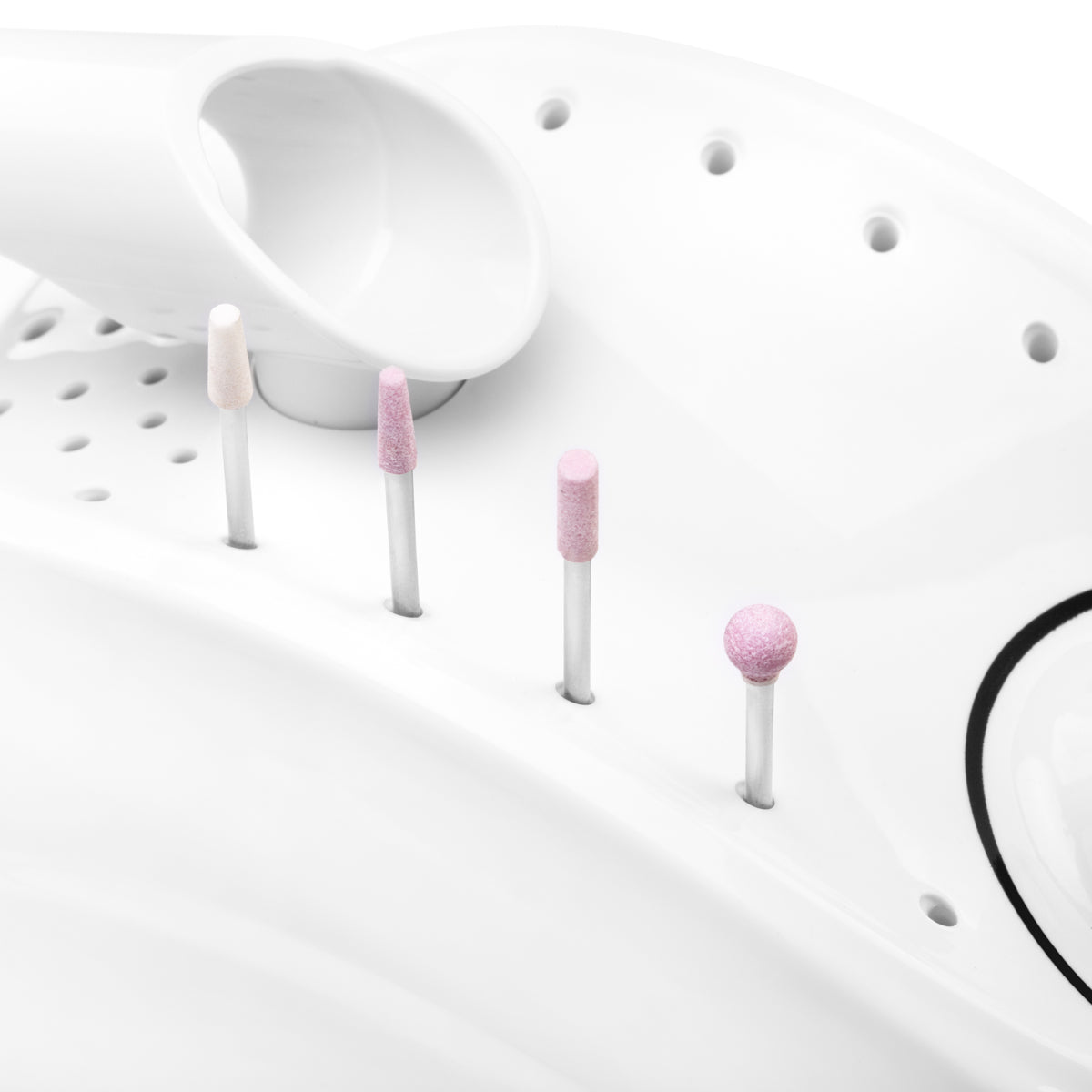 Rękojeść tej frezarki jest naprawdę solidna i osiąga maksymalnie 35 000 obrotów na minutę. Możesz nią sterować zarówno za pomocą panelu, jak i dołączonego pedału nożnego. Obrót wsteczny rękojeści jednym przyciskiem, bez konieczności zatrzymywania. Możesz umieścić rękojeść na uchwycie, który jest przymocowany do panelu sterującego. Specjalna konstrukcja panelu pozwala na włożenie frezów w otwory, dzięki czemu są one zawsze pod ręką.