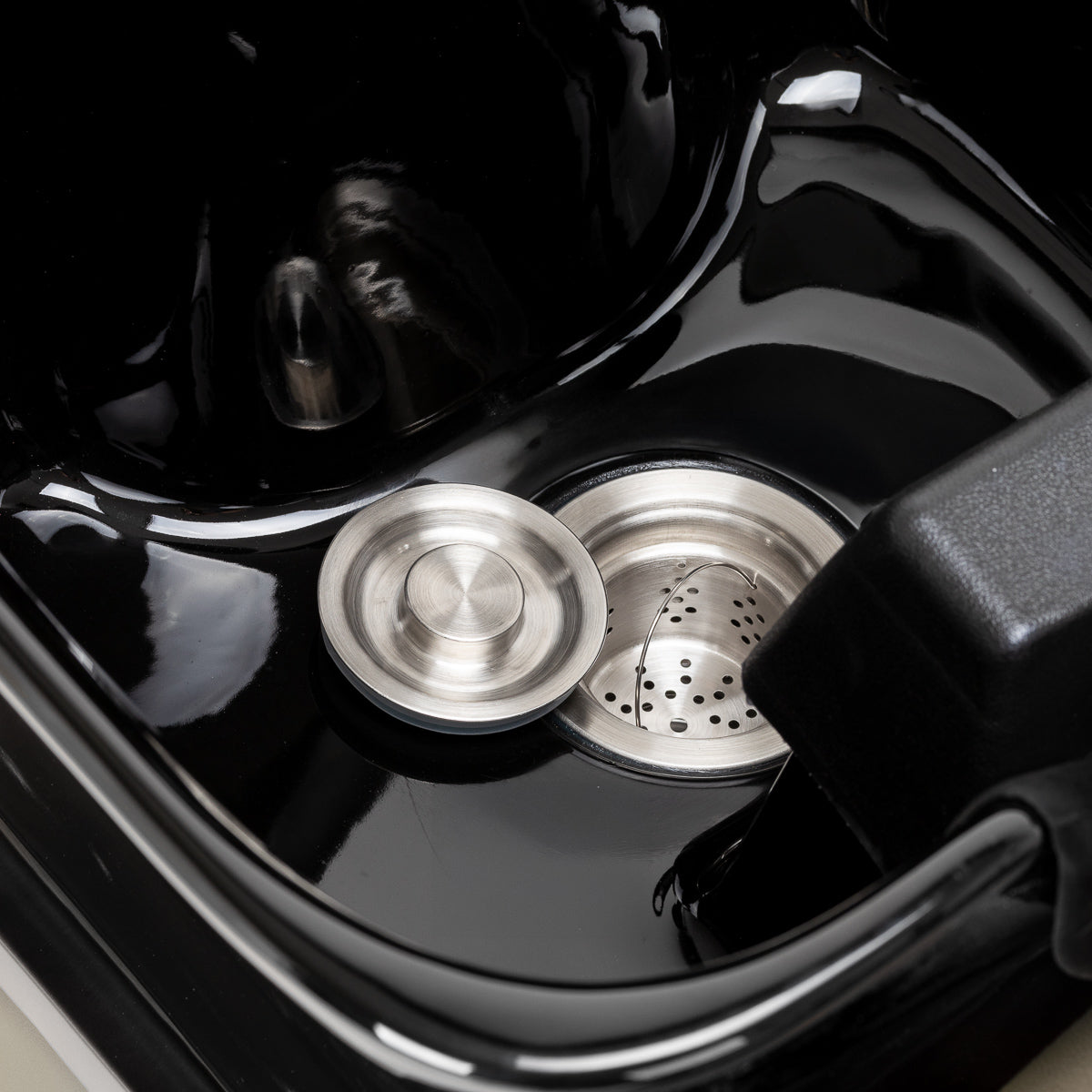Ceramiczna misa w odcieniach czerni, dzięki nowoczesnemu kształtowi i odpowiedniej głębokości, skutecznie zapobiega rozpryskiwaniu wody i produktów stosowanych podczas zabiegów, umożliwiając komfortowe i skuteczne wykonywanie szerokiego zakresu usług. Odpowiednio wyprofilowany kołnierz i skośne oparcie zapewniają wygodę i wsparcie podczas mycia włosów, a czarna plastikowa osłona chroni klienta przed zimną powierzchnią ceramiki, zapewniając przyjemne doznania podczas zabiegu.