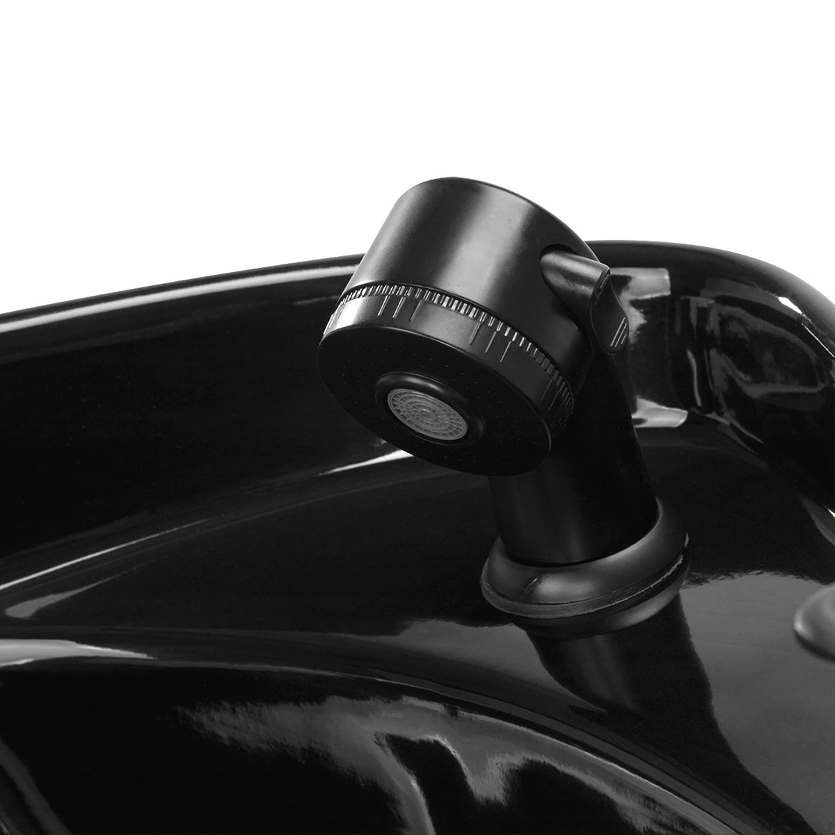 Czarna ceramiczna misa umywalki o odpowiedniej głębokości zapobiega nadmiernemu rozpryskiwaniu wody i produktów stosowanych podczas zabiegu, umożliwiając komfortowe wykonywanie szerokiego zakresu usług. Możliwość regulacji kąta nachylenia misy pozwala na dostosowanie ustawienia do indywidualnych potrzeb. Użyty materiał sprawia, że umywalka jest trwała, odporna na plamy i zarysowania oraz bardzo łatwa w czyszczeniu. Odpowiednio wyprofilowany kołnierz zapewnia wsparcie i wygodę podczas mycia włosów, a dzięki wygodnej plastikowej osłonie klient nie odczuje nieprzyjemnego chłodu ceramicznej powierzchni.