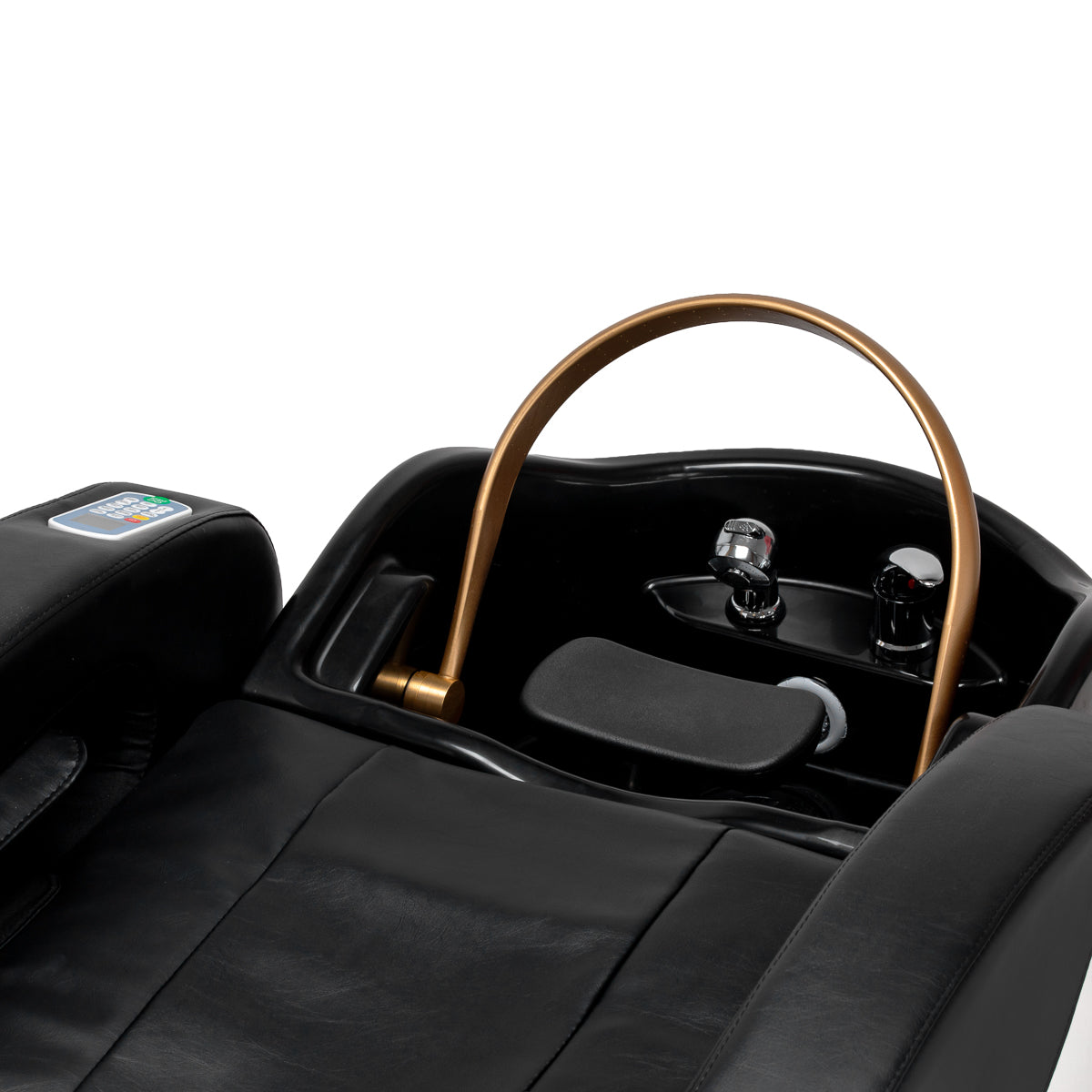 Panel sterowania, umieszczony z tyłu prawego podłokietnika, zapewnia specjaliście wygodną i pełną kontrolę nad parametrami zabiegu. Pozwala regulować temperaturę wody w obiegu zamkniętym w zakresie 30–50°C oraz monitorować jej wartość w czasie rzeczywistym na czytelnym wyświetlaczu, umożliwiając precyzyjne dopasowanie ustawień do potrzeb klienta. Panel pozwala także aktywować funkcję terapii światłem w formie podświetlenia misy, które tworzy relaksującą atmosferę i podkreśla luksusowy charakter zabiegu. Z poziomu panelu można regulować intensywność masażu, włączyć funkcję podgrzewania pleców oraz wybrać czas masażu – domyślnie ustawiony na 20 minut, z możliwością dostosowania do 10, 15, 20 lub 40 minut. System oferuje trzy poziomy intensywności masażu realizowanego przez głowice oraz trzy poziomy masażu uciskowego za pomocą poduszek powietrznych, umożliwiając precyzyjne dopasowanie działania urządzenia do indywidualnych preferencji klienta.
