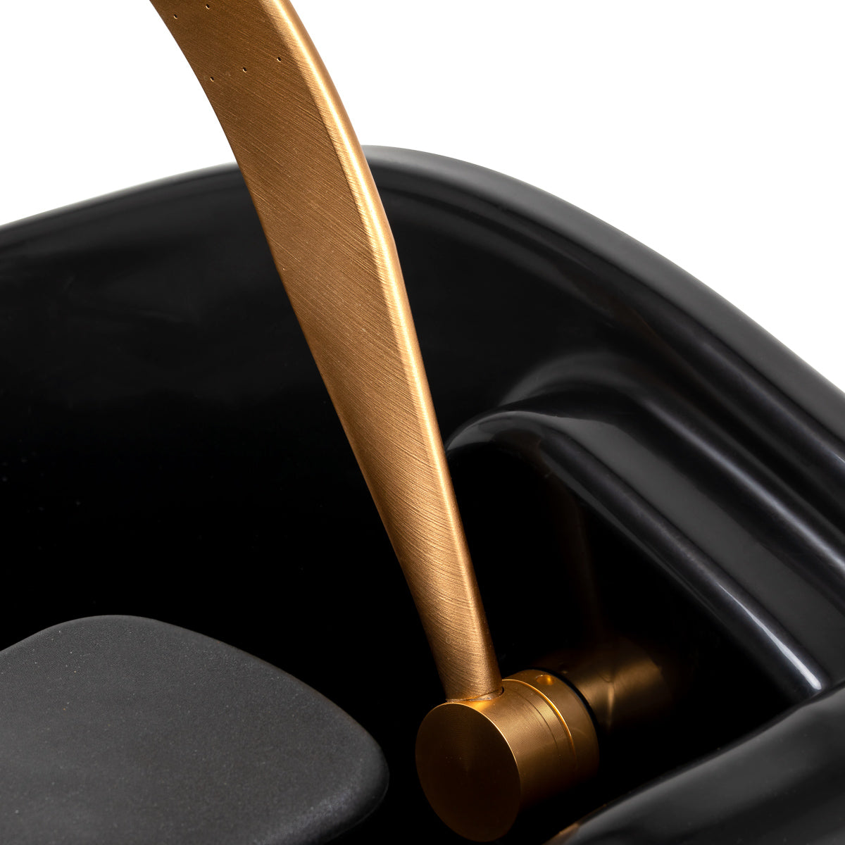Głęboka plastikowa misa w eleganckim odcieniu czerni skutecznie minimalizuje rozpryskiwanie wody i kosmetyków, zapewniając czyste otoczenie i wygodne warunki pracy. Wykonana z trwałych materiałów, jest solidna, a jej gładka powierzchnia ułatwia szybkie i bezproblemowe utrzymanie higieny. Regulowany zagłówek pozwala na idealne dopasowanie do potrzeb użytkownika, gwarantując maksymalny komfort. Połączenie funkcjonalności i nowoczesnego designu podnosi standard każdego profesjonalnego wnętrza.