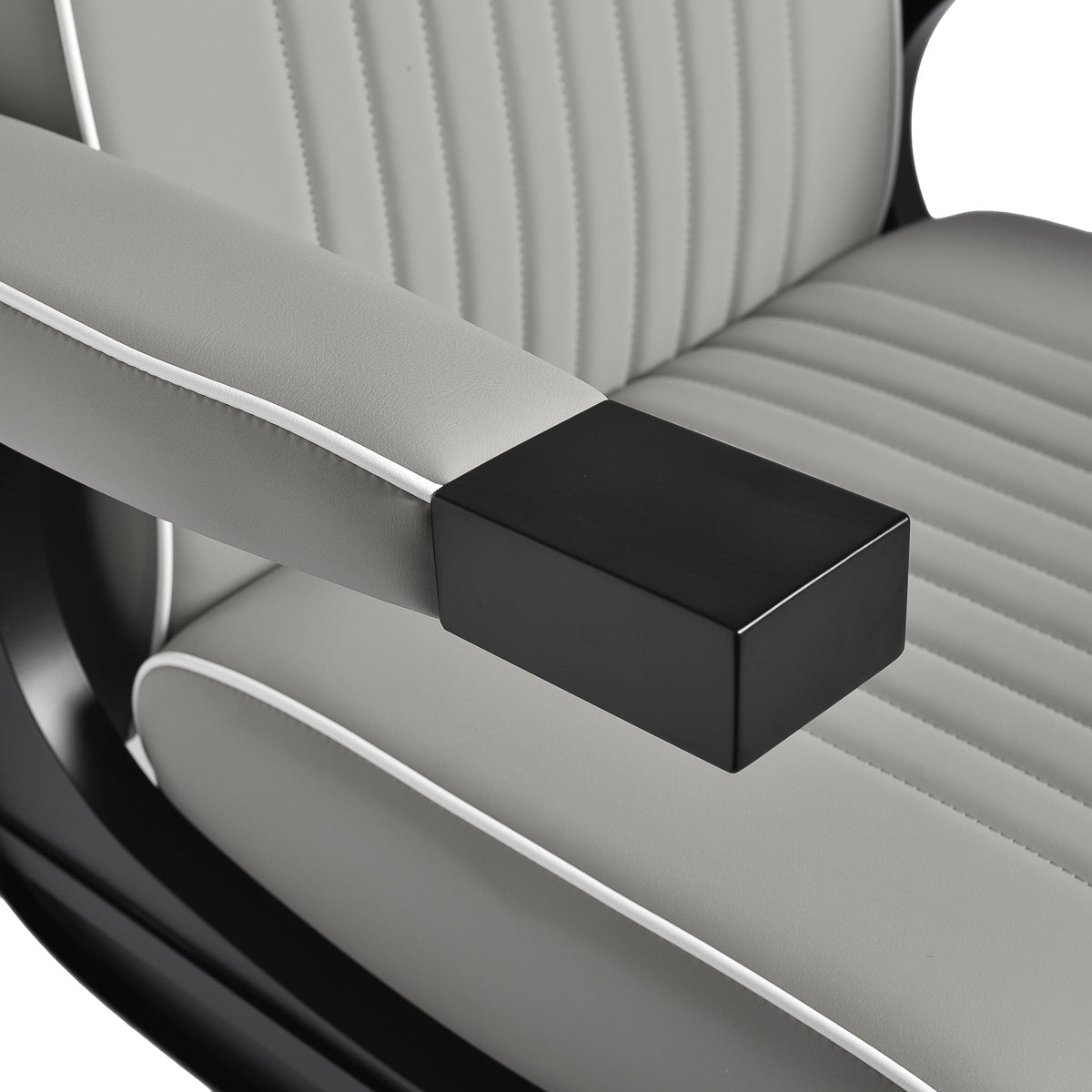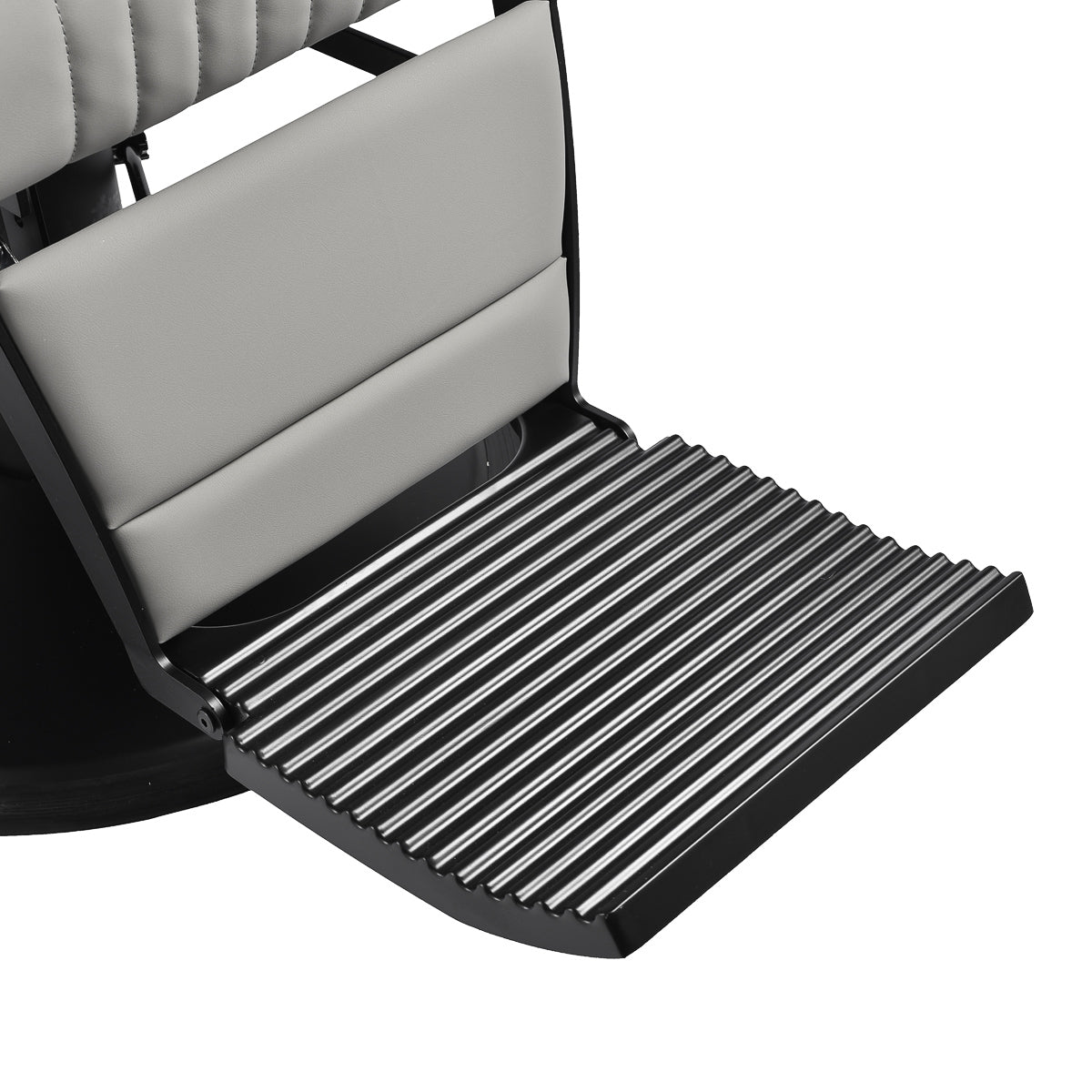 Czarna, okrągła podstawa zapewnia stabilność i trwałość. Miękka, matowa tapicerka ze skóry syntetycznej łączy komfort z wytrzymałością. Użyte materiały są odporne na wilgoć, trwałe i łatwe do czyszczenia. Stylowe przeszycia i szaro-tonowa tapicerka nadają mu niepowtarzalny charakter, doskonale uzupełniając wystrój nowoczesnych salonów barberskich. Połączenie eleganckiego koloru tapicerki z czarną ramą i podstawą podkreśla nowoczesny, profesjonalny wygląd fotela.