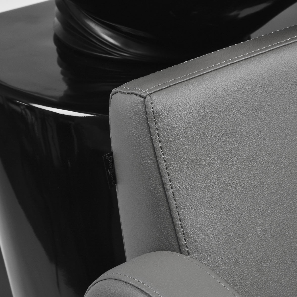 Głęboka ceramiczna misa w odcieniach czerni ogranicza rozpryskiwanie wody i produktów stosowanych podczas zabiegów. Regulowany kąt nachylenia misy pozwala na dopasowanie do indywidualnych potrzeb, a użyty materiał sprawia, że umywalka jest trwała, odporna na plamy i zarysowania oraz łatwa do utrzymania w czystości. Ergonomicznie profilowany kołnierz zapewnia wygodne podparcie głowy, a miękka czarna osłona z tworzywa sztucznego eliminuje uczucie chłodu od ceramicznej powierzchni.