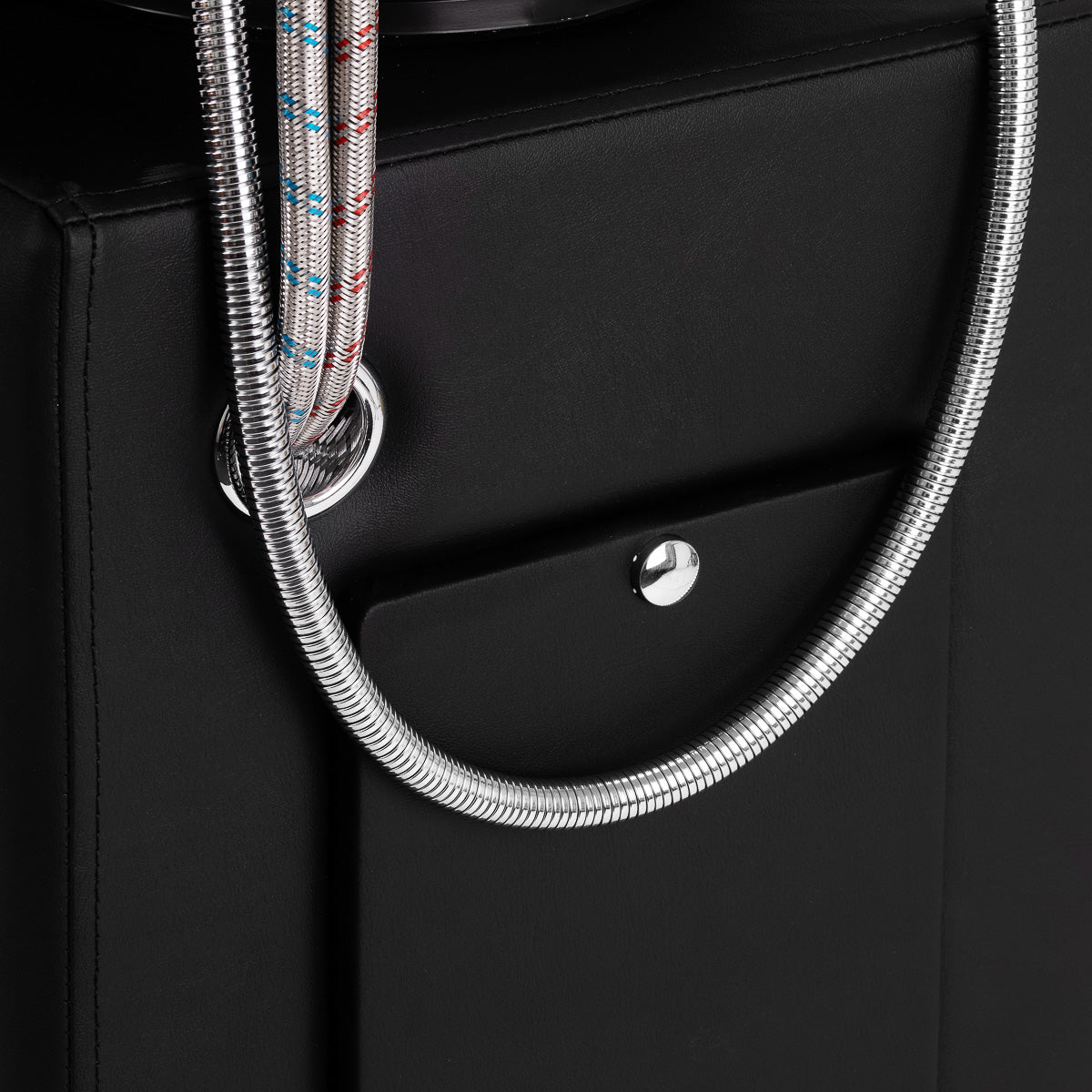 The ergonomically profiled chair with durable foam filling ensures high comfort of use. The subtly curved, partially upholstered armrests allow for correct shoulder positioning and are an attractive visual element. The comfortable backrest guarantees stable back support and the correct position during the treatment. The black upholstery combined with decorative metal elements gives the whole a timeless, elegant character. The materials used are distinguished by their durability and ease of cleaning. The original form of the wash unit gives the interior a unique character. The set includes complete fittings, including a tap, shower head and dedicated hoses, ensuring full readiness for use.