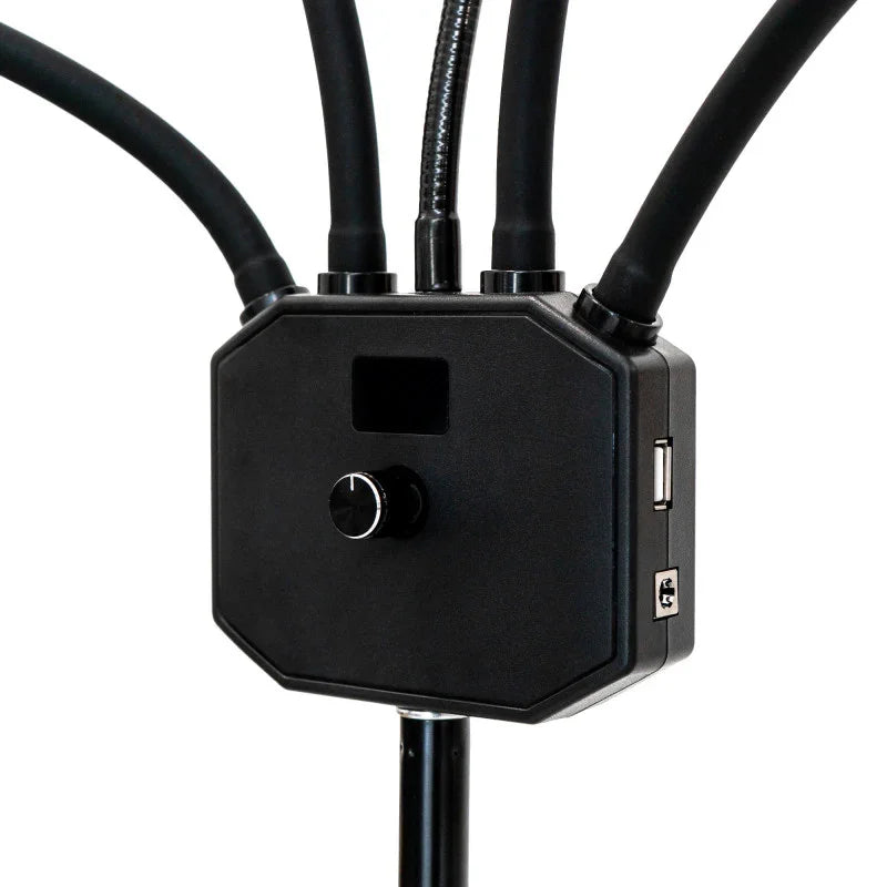 Dzięki przyjaznemu panelowi sterowania z wyświetlaczem możesz szybko dokonywać precyzyjnych ustawień. Dołączony regulowany statyw zapewnia stabilność i elastyczność w każdym studiu. Wbudowany port USB umożliwia ładowanie telefonu lub urządzenia podczas długich sesji bez konieczności korzystania z dodatkowego gniazdka.