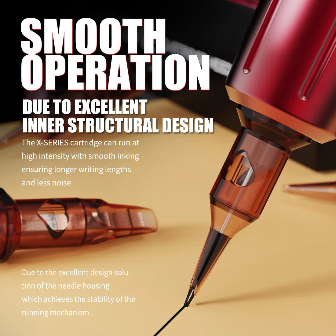 - Zaawansowana struktura wewnętrzna – Zbudowane z precyzyjnego mechanizmu wewnętrznego, który gwarantuje stały przepływ tuszu, zmniejszenie hałasu oraz stabilność podczas długich sesji.