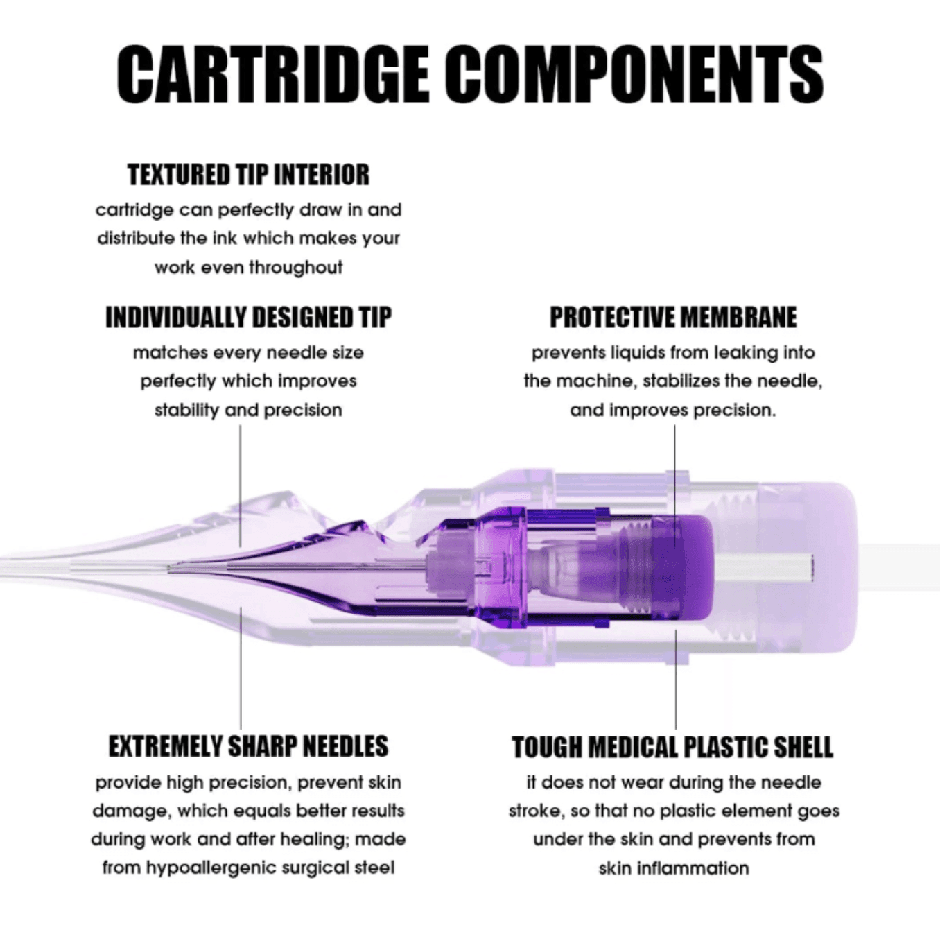 - Indywidualnie zaprojektowane końcówki: Każdy kartridż posiada indywidualnie zaprojektowaną końcówkę, która idealnie dopasowuje się do odpowiadającego rozmiaru igły, zwiększając stabilność i dokładność. Ta dbałość o szczegóły pozwala artystom pracować z pewnością siebie.