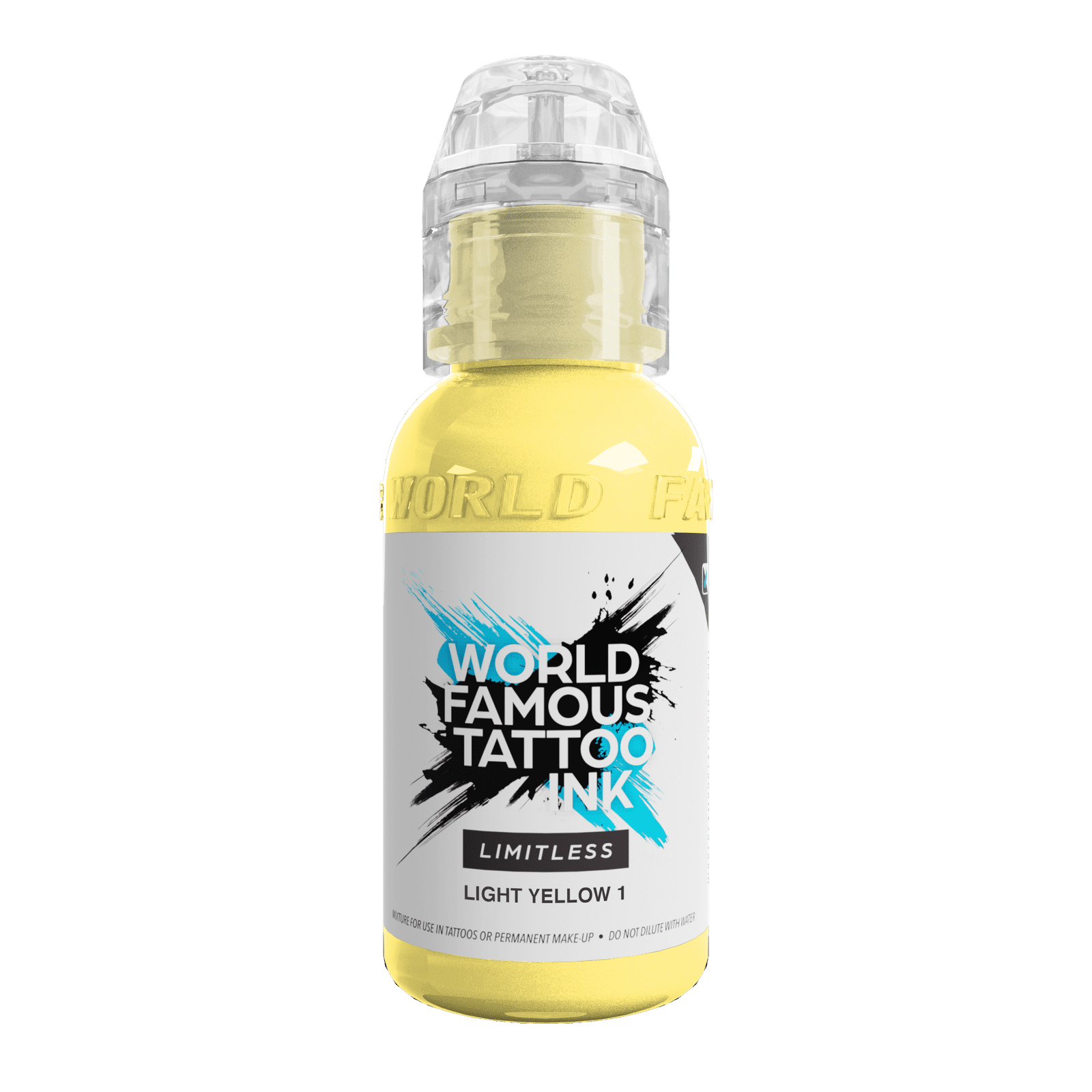 Light Yellow 1 z kolekcji Limitless to delikatny, świetlisty żółty, który dodaje subtelnego blasku każdemu projektowi tatuażu. Ten odcień jest idealny do podkreśleń, tworzenia łagodnych przejść tonalnych lub wzmacniania pastelowych tonów w pracach kwiatowych, ilustracyjnych lub portretowych. Jego subtelne ciepło czyni go doskonałą bazą lub towarzyszem do mieszania z pomarańczami, zieleniami i odcieniami skóry.